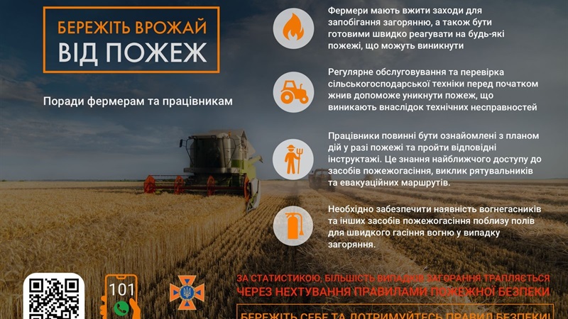 Рекомендації з забезпечення охорони врожаю зернових культур і грубих кормів від пожеж для сільгосппідприємств усіх форм власності та фермерських господарствНаказами керівників об'єктів, задіяних у збиранні та зберіганні сільгосппродукції, призначити відповідальних осіб за пожежну безпеку, яким доручити здійснення контролю за протипожежним станом, справністю електроустановок10 липня 2025 15:36
