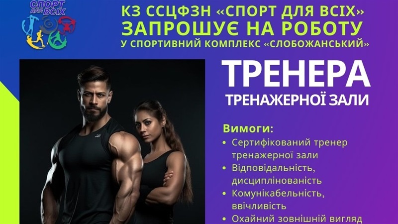 КЗ ССЦФЗН «Спорт для всіх» запрошує на роботу тренера тренажерної залиКЗ «Слобожанський селищний центр фізичного здоров’я населення «Спорт для всіх» запрошує на роботу тренера тренажерної зали у спортивний комплекс «Слобожанський»04 березня 2026 09:1627 Спорт