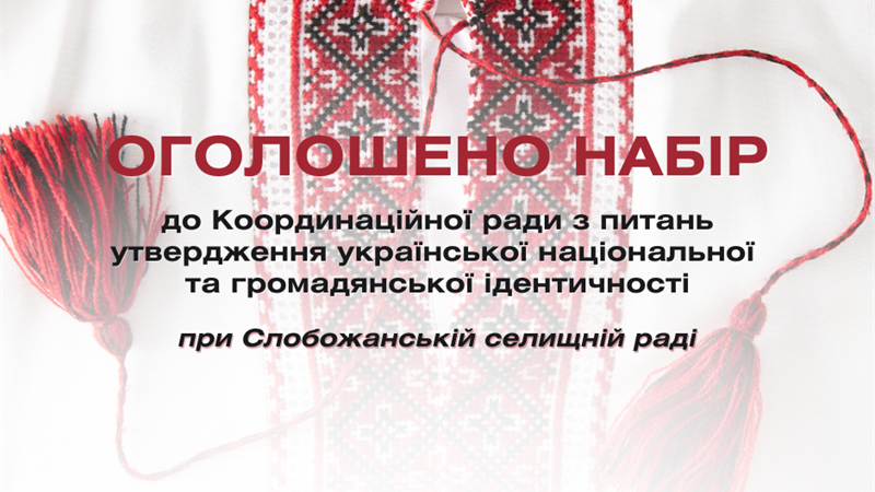 ОГОЛОШЕННЯ про формування складу Координаційної ради з питань утвердження української національної та громадянської ідентичності при Слобожанській селищній радіОголошення про формування складу Координаційної ради з питань утвердження української національної та громадянської ідентичності при Слобожанській селищній раді.15 грудня 2025 11:0947 Новини
