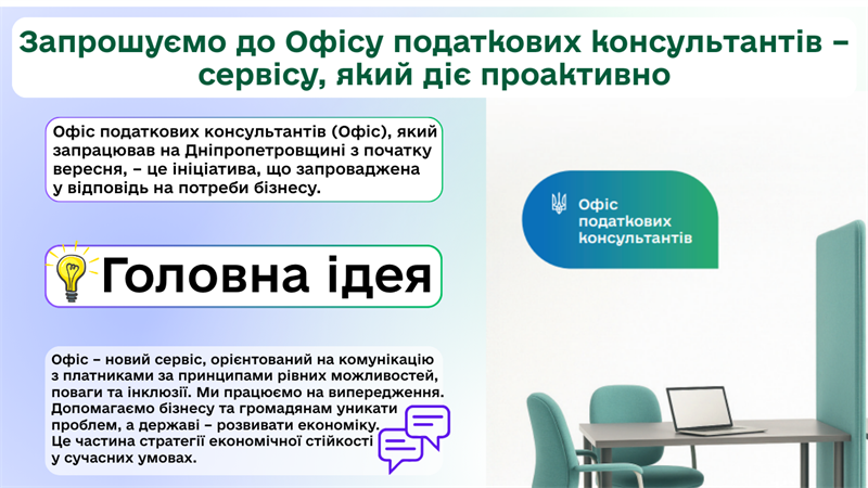 Запрошуємо до Офісу податкових консультантів – сервісу, який діє проактивноОфіс податкових консультантів (Офіс), який запрацював на Дніпропетровщині з початку вересня, – це ініціатива, що запроваджена у відповідь на потреби бізнесу30 вересня 2025 15:45