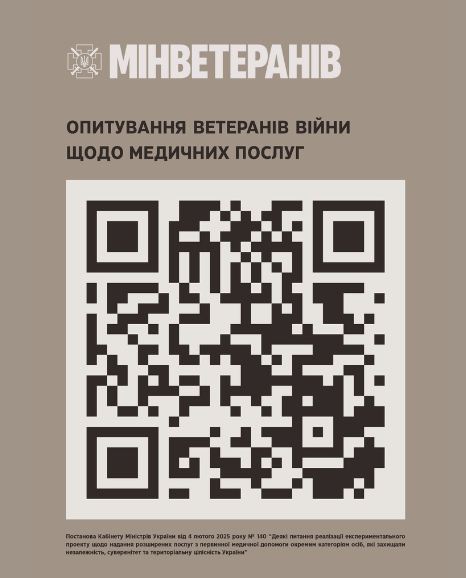 Міністерство у справах ветеранів України проводить анонімне опитування серед ветеранів і ветеранок з метою оцінки якості медичних послуг, які надаються у рамках експериментального проєкту з розширення первинної медичної допомоги захисникам.