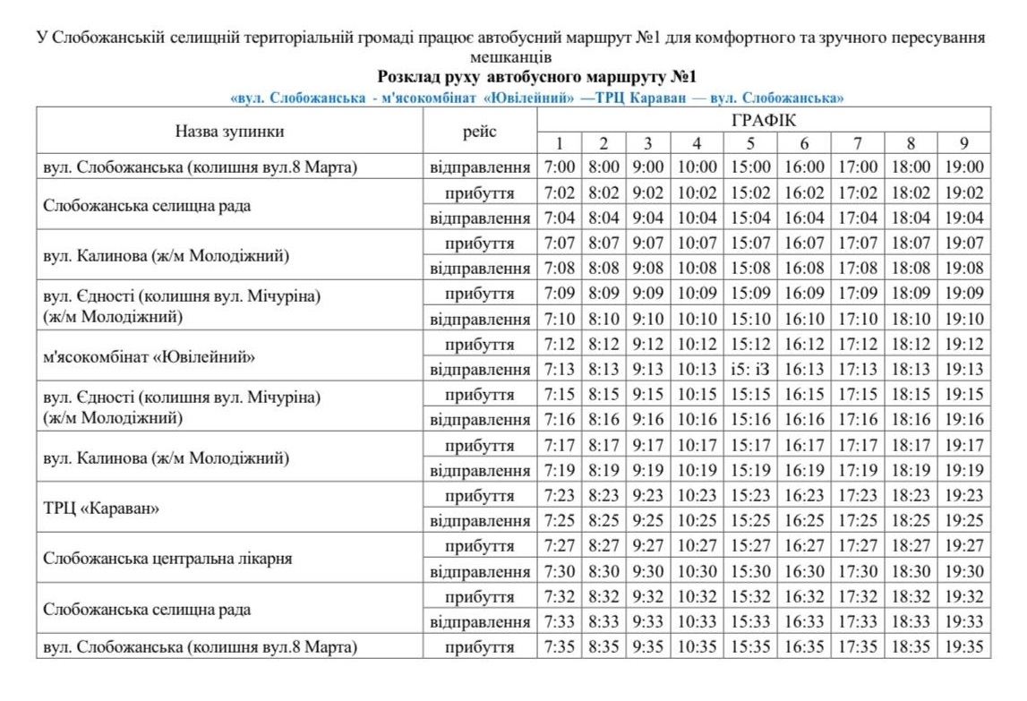 У зв’язку з тимчасовими змінами руху міжміських маршрутів №115 та №59, з 08 вересня 2025 року збільшено кількість рейсів автобусного маршруту №1 «вул. Слобожанська — м’ясокомбінат «Ювілейний» — ТРЦ «Караван» — вул. Слобожанська».