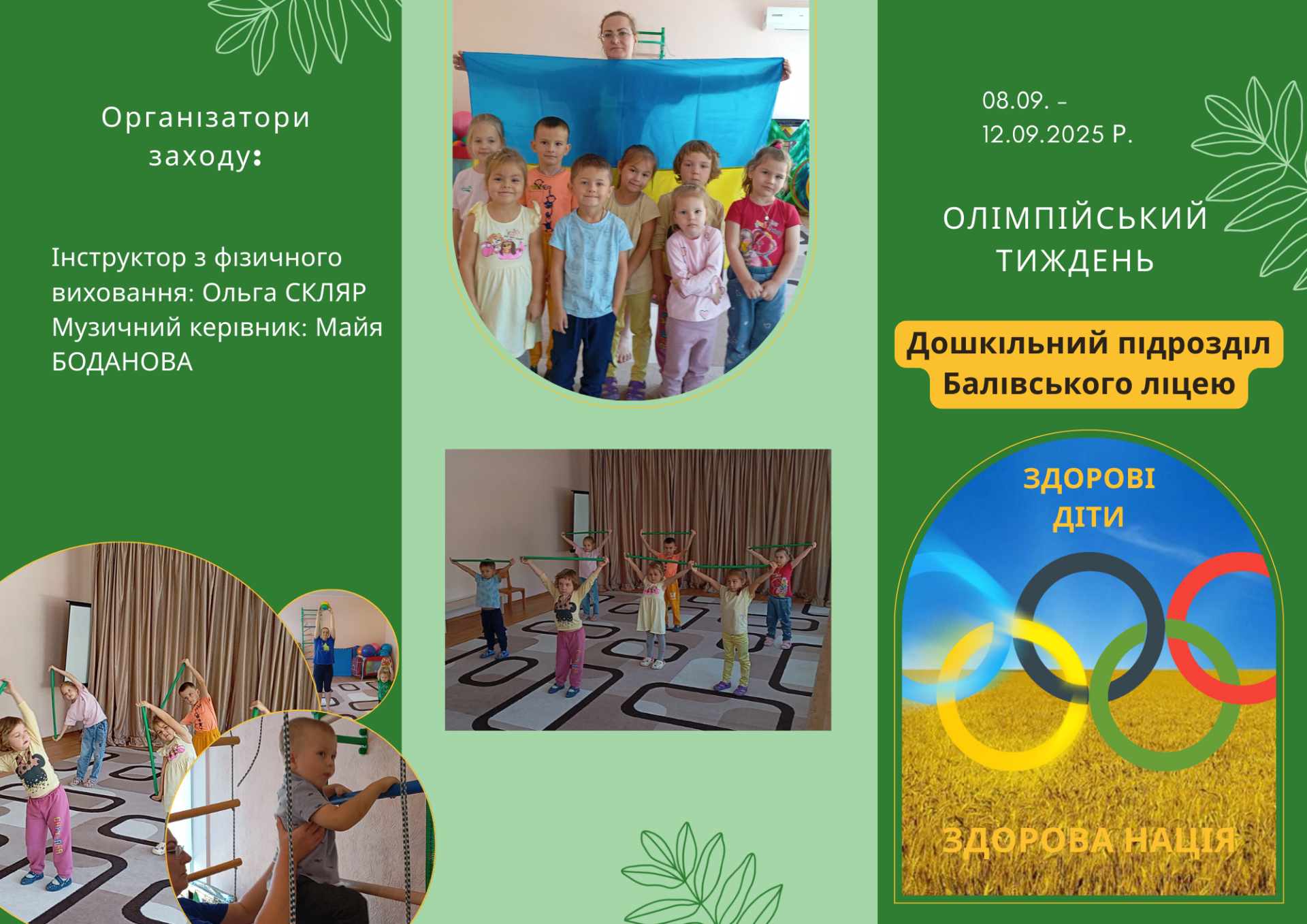 З 8 по 12 вересня у закладі пройшов Олімпійський тиждень. Педагоги підготували низку заходів, спрямованих на популяризацію спорту, здорового способу життя та розвиток олімпійського руху в Україні. Організаторами події стали інструктор з фізичного виховання Ольга Скляр та музичний керівник Майя Боданова.