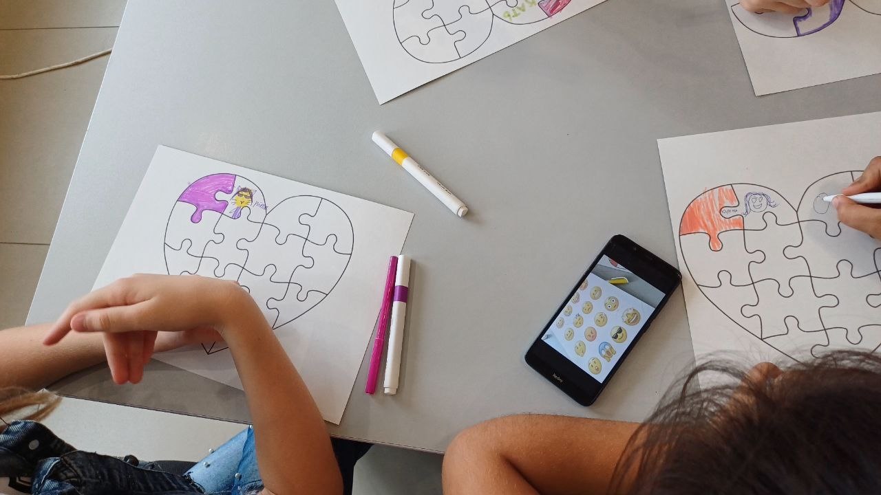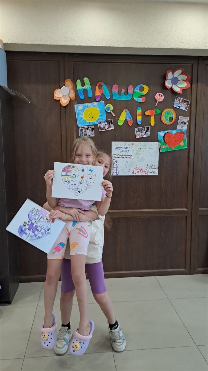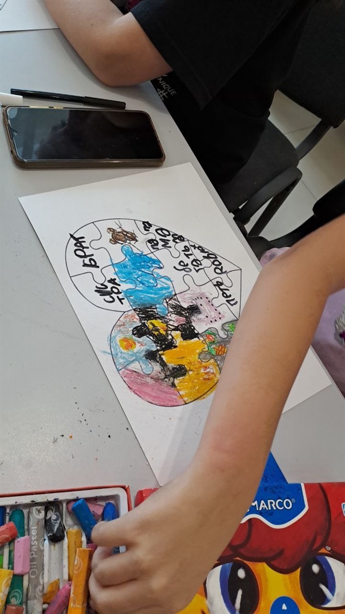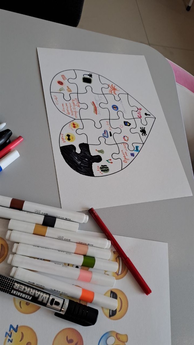 Особливістю заняття стало створення арт-об’єкта «Пазл серця». Кожен учасник отримав аркуш із великим контуром серця, який потрібно було поділити на частини, немов на пазл. У кожному фрагменті діти відобразили те, що для них є найдорожчим: барви веселки, друзів, домашніх улюбленців, квіти, родину, улюблені заняття чи речі. Хтось зобразив себе у колі рідних, інші наповнили свої серця яскравими образами природи чи кумедних звіряток.