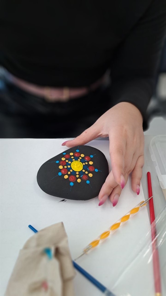 Особливим завданням стало створення мандали на камінцях – символі гармонії, рівноваги та внутрішнього спокою. Кожен обрав камінчик, який найбільше відгукнувся саме йому, і прикрасив його барвами та візерунками, що відображали настрій, емоції та внутрішній стан. У результаті вийшли унікальні роботи, де кожна лінія чи колір мали власний сенс.