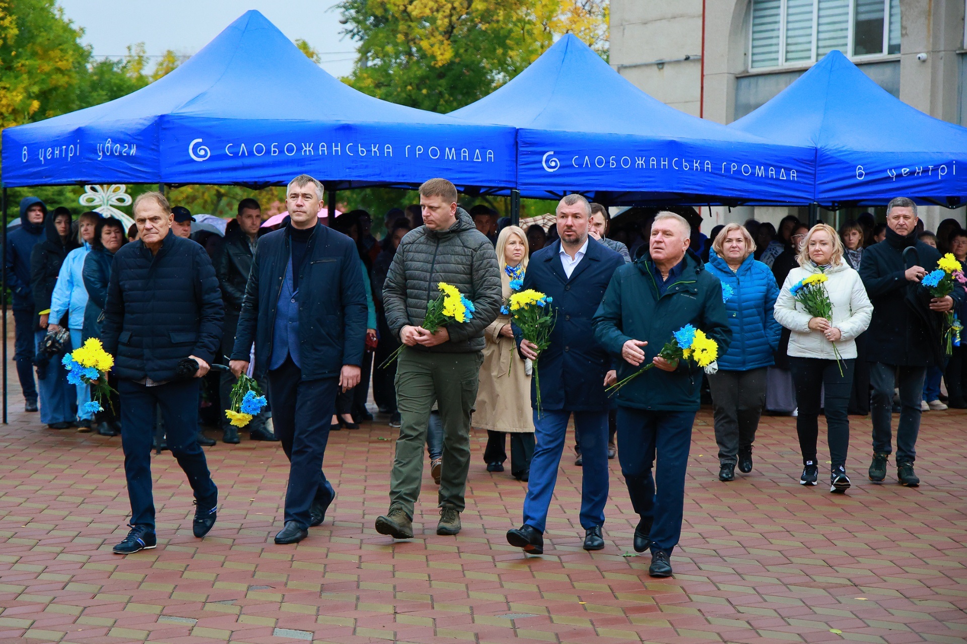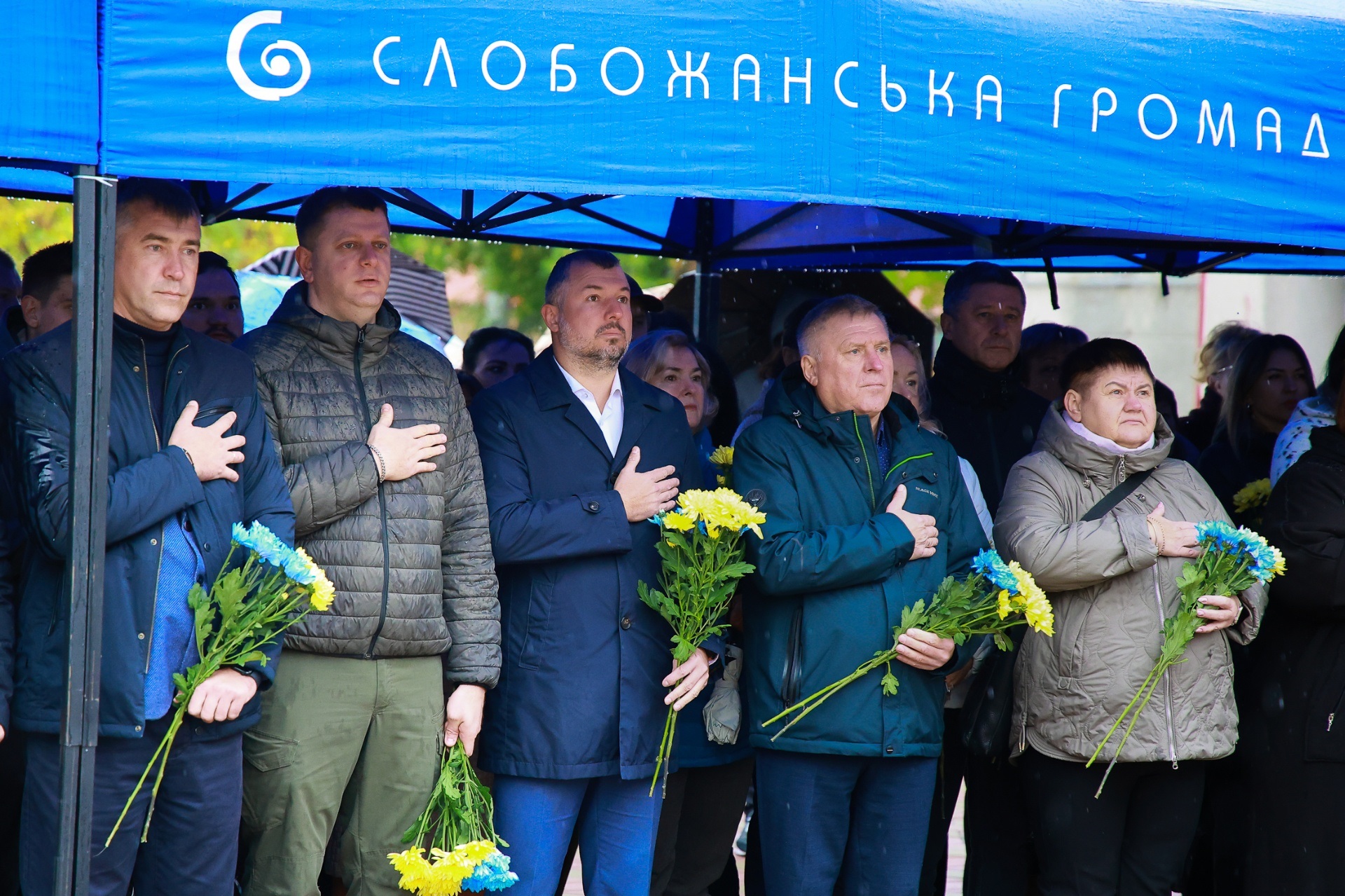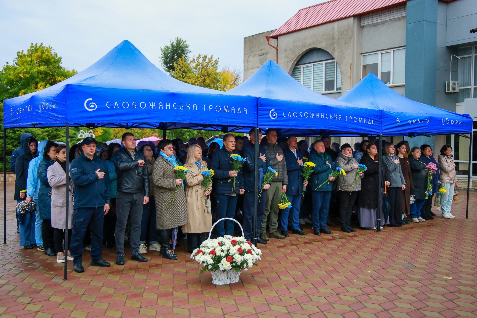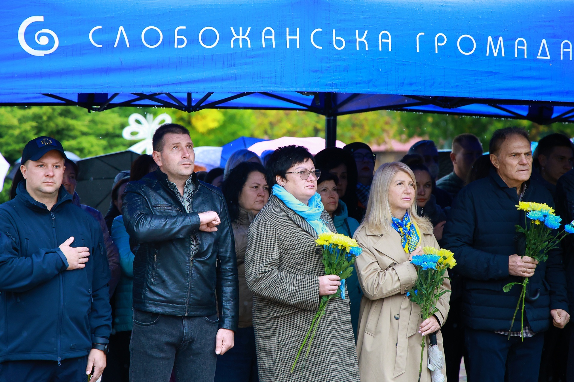 Попри дощову погоду, на площі перед Слобожанським центром культурних послуг зібралося чимало людей. На заході були присутні селищний голова Іван Камінський, начальник Дніпровської районної військової адміністрації В'ячеслав Мамонов, керівник Слобожанської прокуратури Володимир Кондратов, секретар селищної ради (виконкому) Людмила Лагода, перший заступник селищного голови Ігор Шаповалов та заступники селищного голови, старости населених пунктів, сім’ї загиблих захисників України, представники депутатського корпусу, працівники комунальних закладів, молодь та жителі громади.