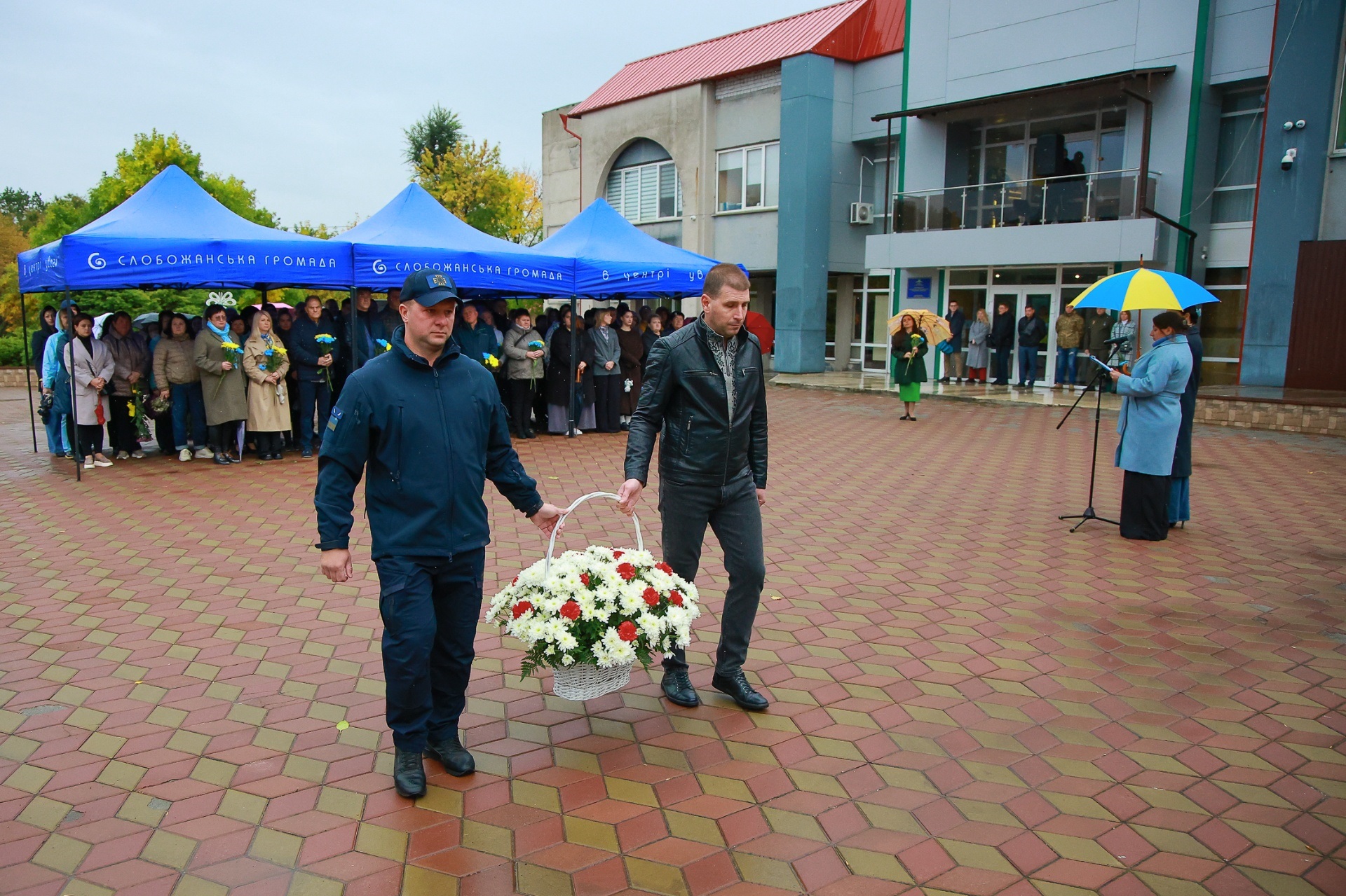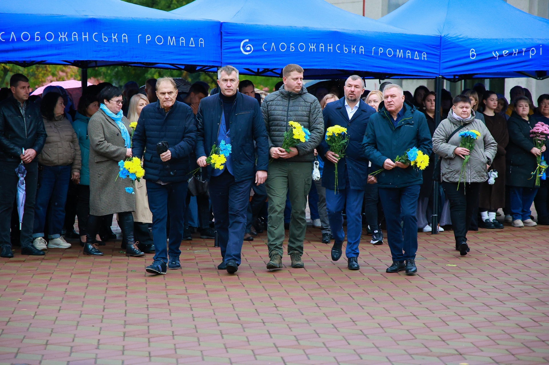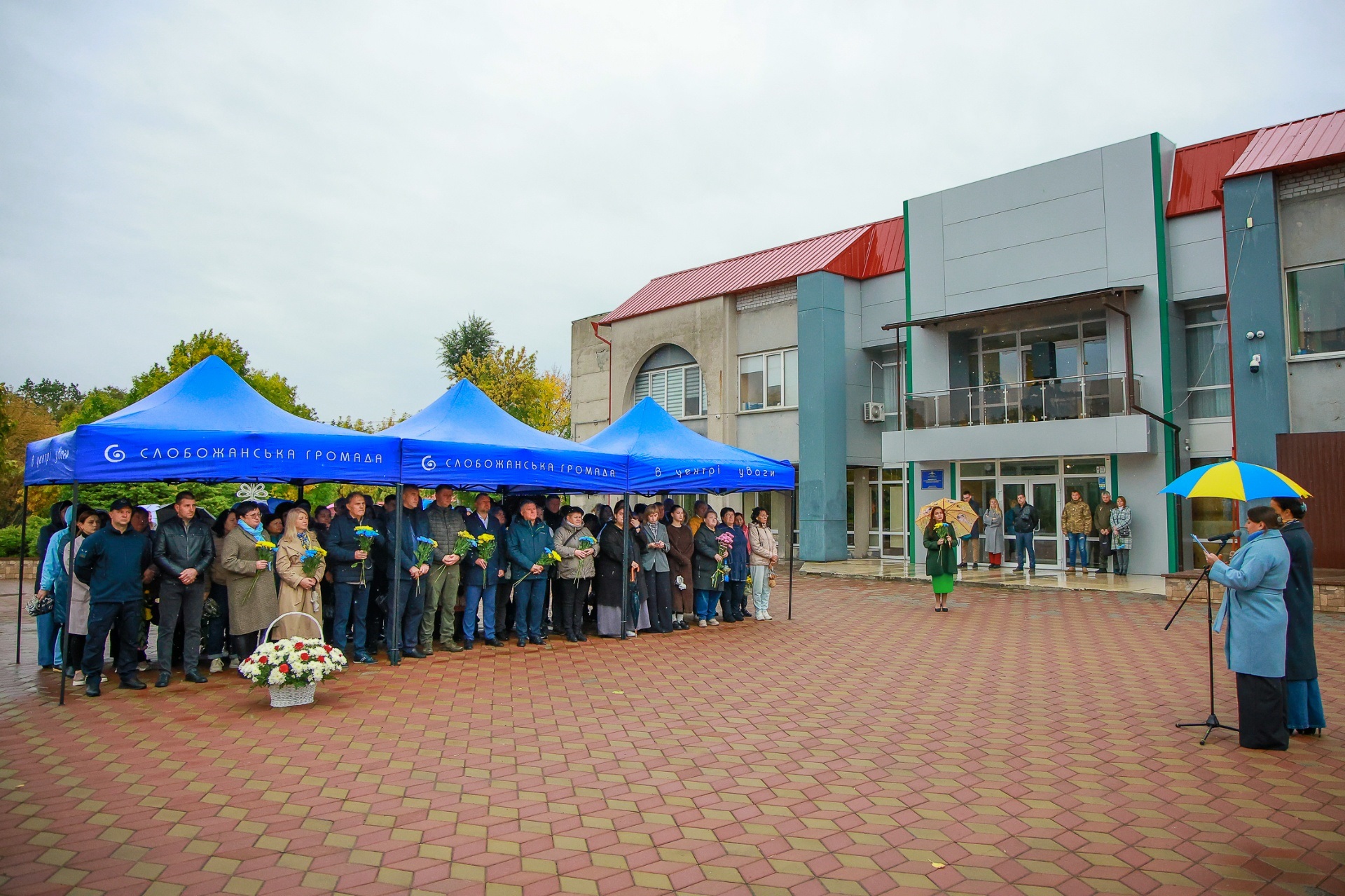 Попри дощову погоду, на площі перед Слобожанським центром культурних послуг зібралося чимало людей. На заході були присутні селищний голова Іван Камінський, начальник Дніпровської районної військової адміністрації В'ячеслав Мамонов, керівник Слобожанської прокуратури Володимир Кондратов, секретар селищної ради (виконкому) Людмила Лагода, перший заступник селищного голови Ігор Шаповалов та заступники селищного голови, старости населених пунктів, сім’ї загиблих захисників України, представники депутатського корпусу, працівники комунальних закладів, молодь та жителі громади.
