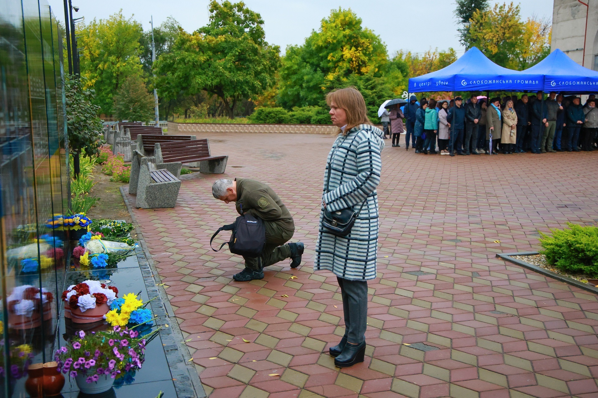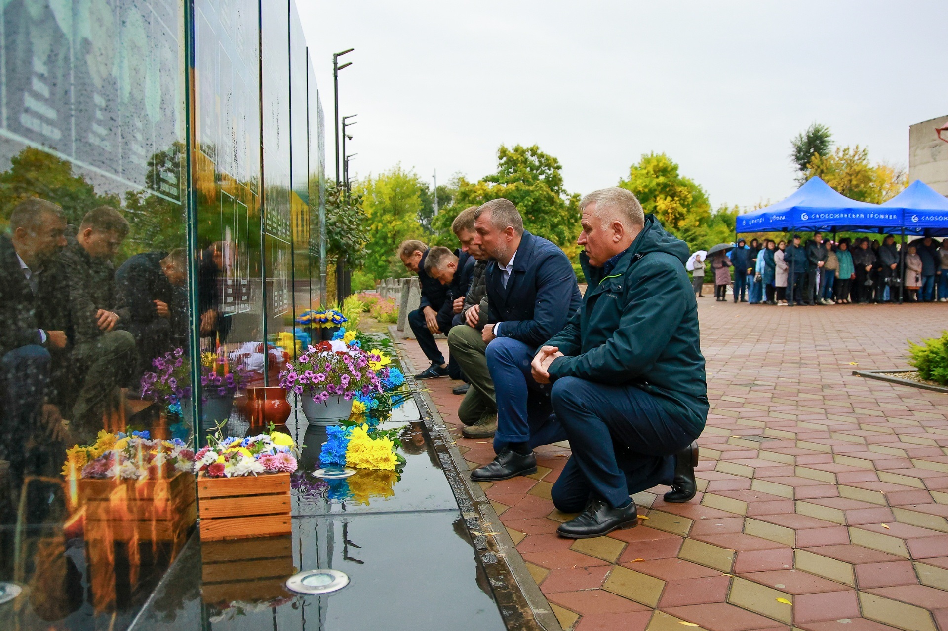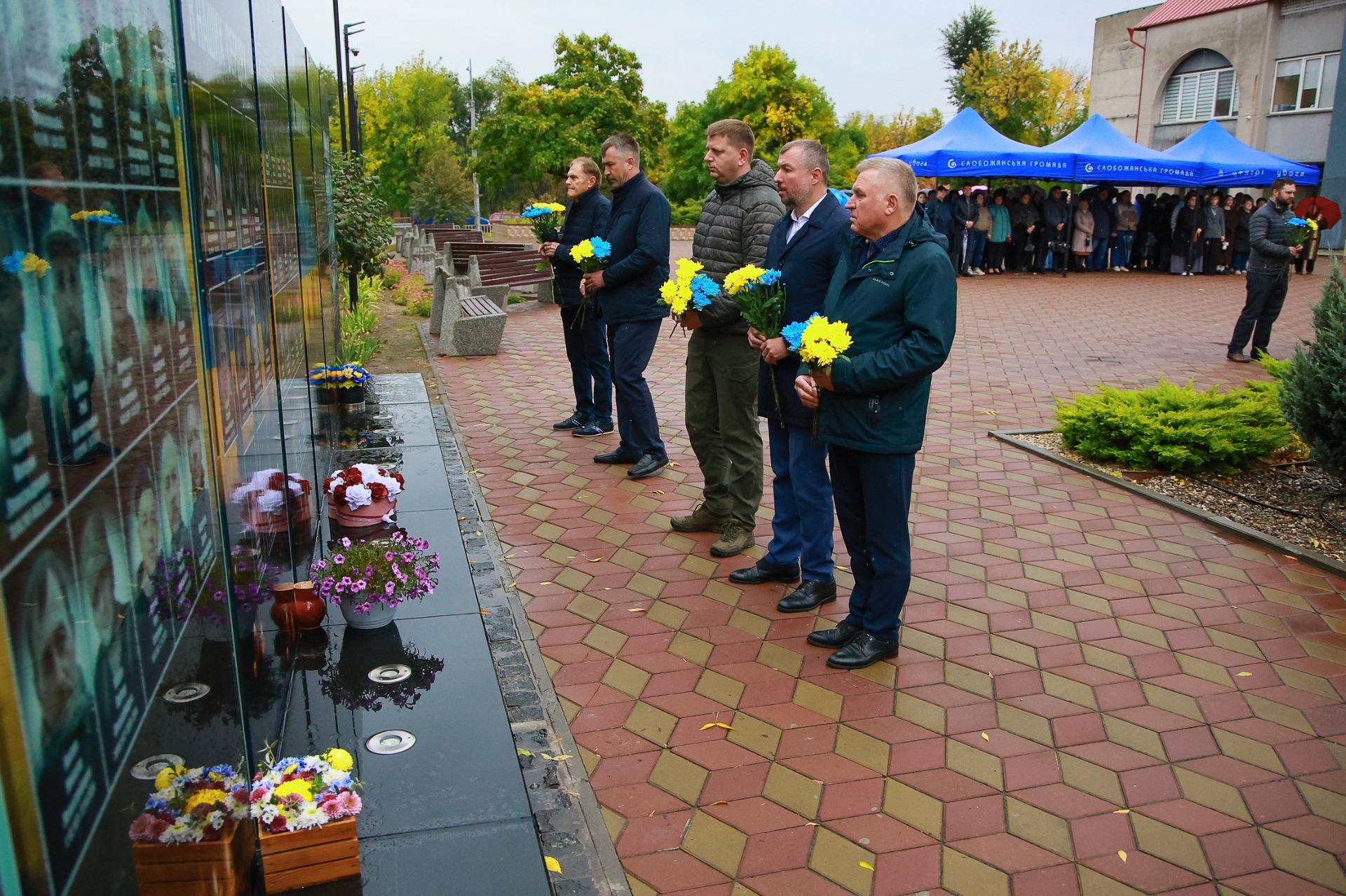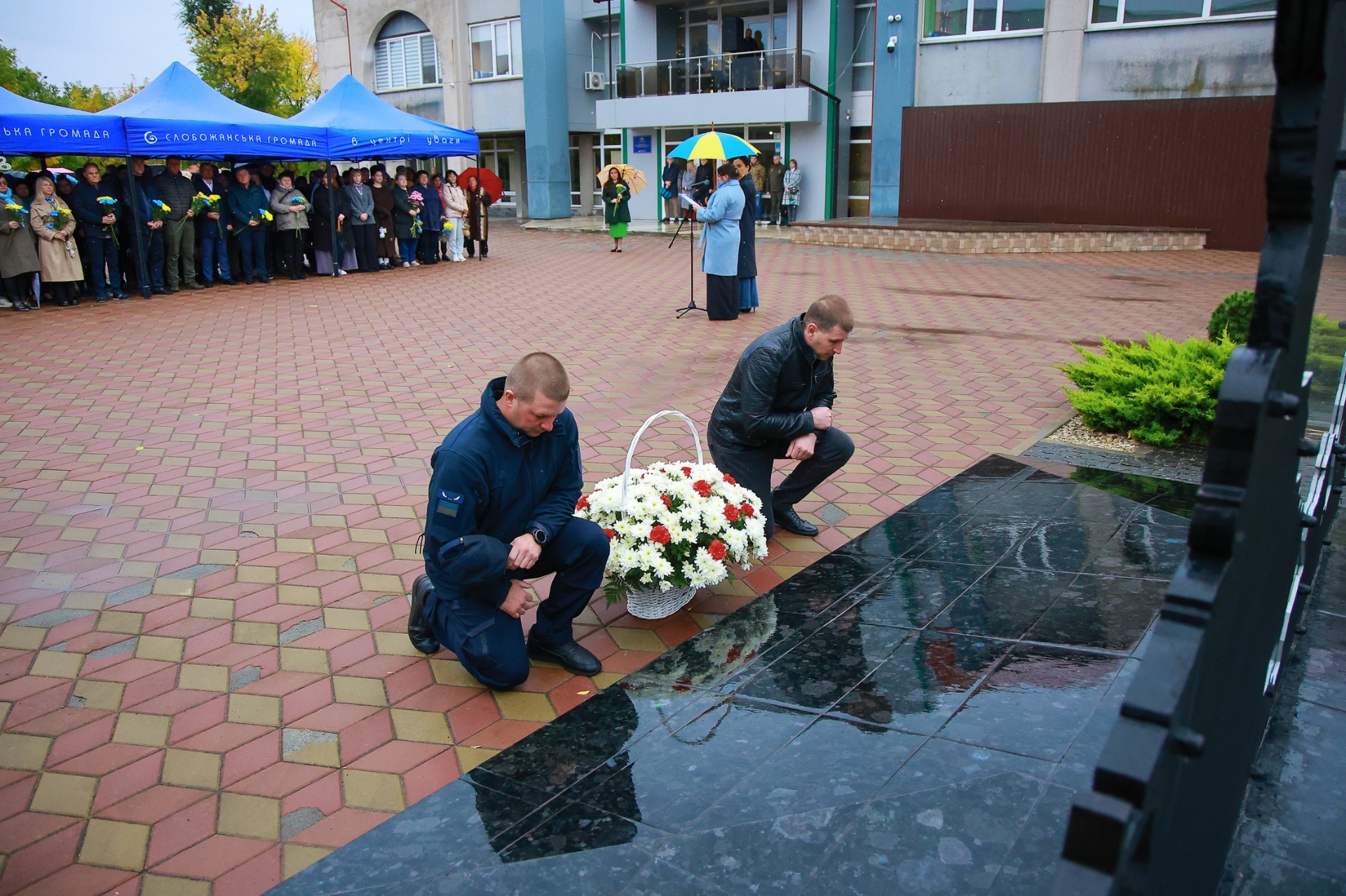 Попри дощову погоду, на площі перед Слобожанським центром культурних послуг зібралося чимало людей. На заході були присутні селищний голова Іван Камінський, начальник Дніпровської районної військової адміністрації В'ячеслав Мамонов, керівник Слобожанської прокуратури Володимир Кондратов, секретар селищної ради (виконкому) Людмила Лагода, перший заступник селищного голови Ігор Шаповалов та заступники селищного голови, старости населених пунктів, сім’ї загиблих захисників України, представники депутатського корпусу, працівники комунальних закладів, молодь та жителі громади.