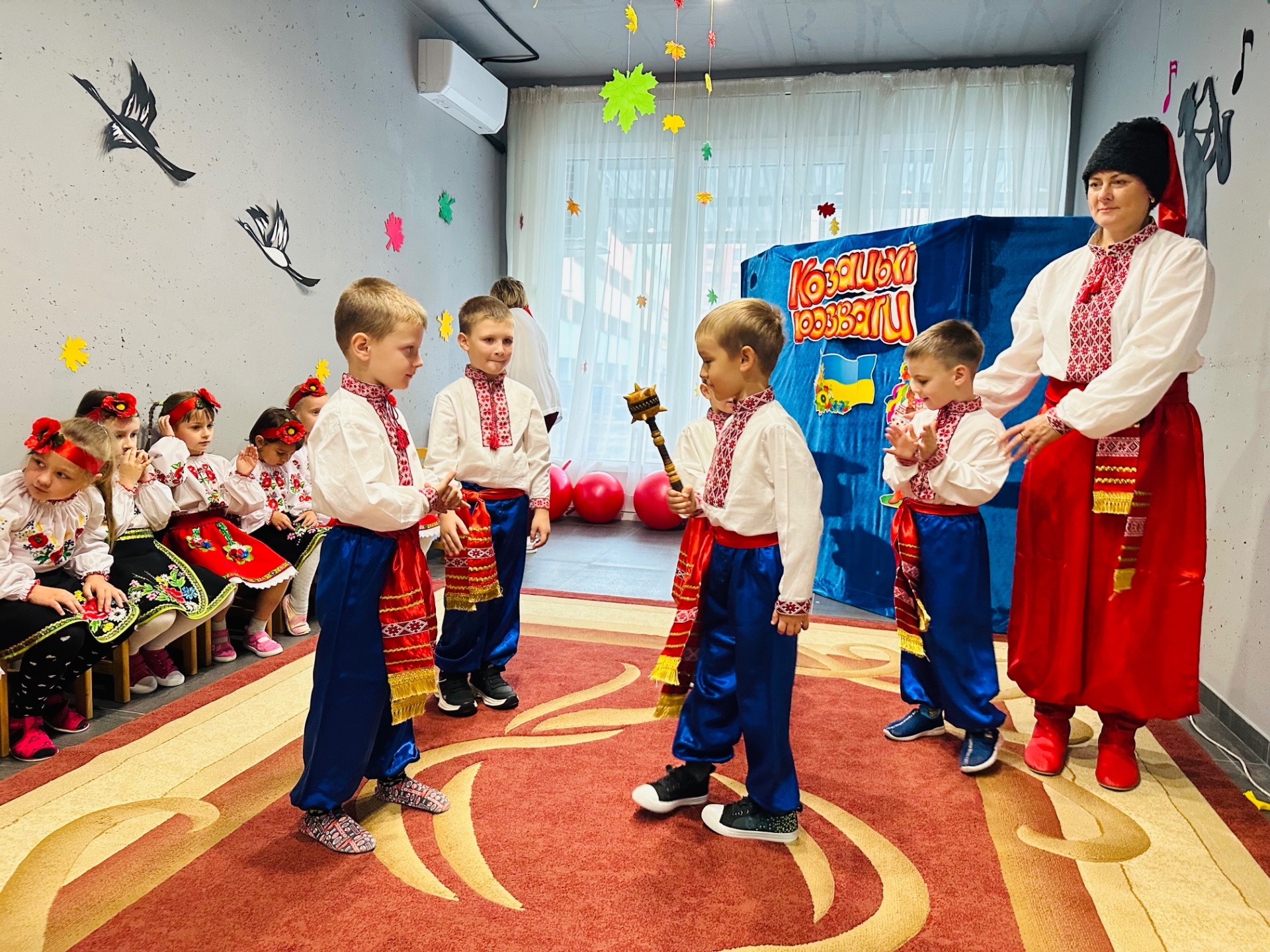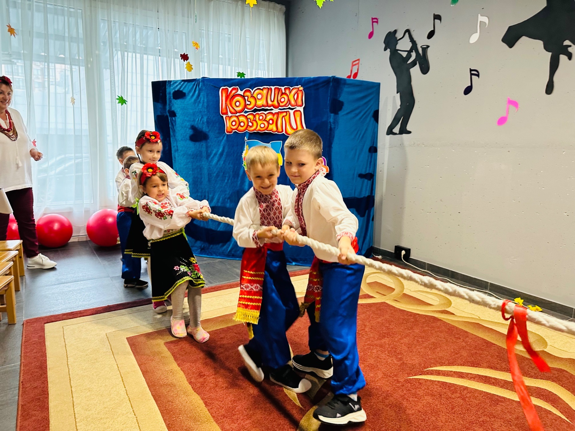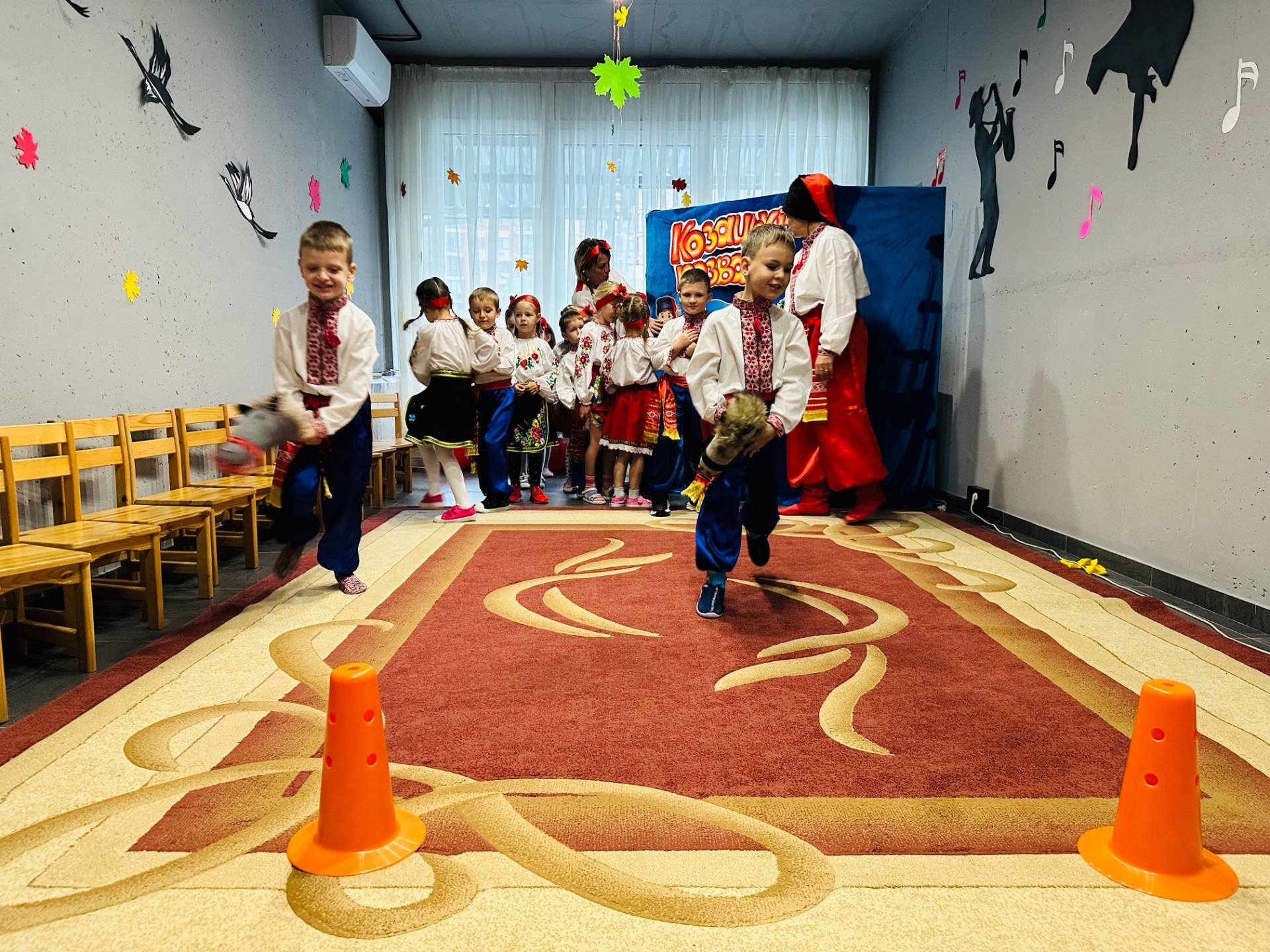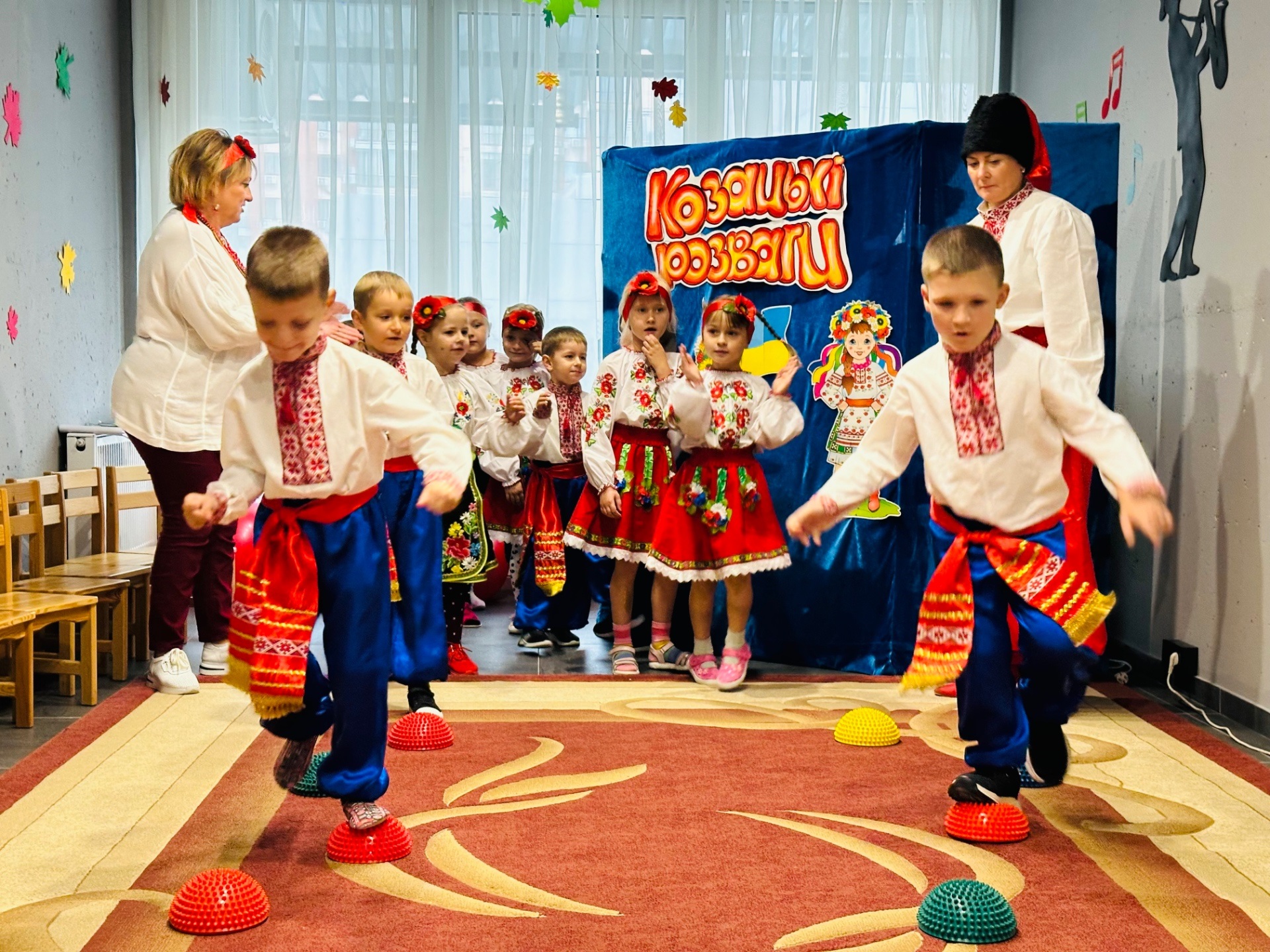 Дівчатка теж не залишилися осторонь – вони із задоволенням долучилися до рухливої гри «Чарівний віночок», у якій проявили кмітливість, витонченість і дружність. Завершальним акордом свята став музичний номер «Козачата». Діти співали й танцювали з особливим запалом, наповнюючи залу радістю та енергією.