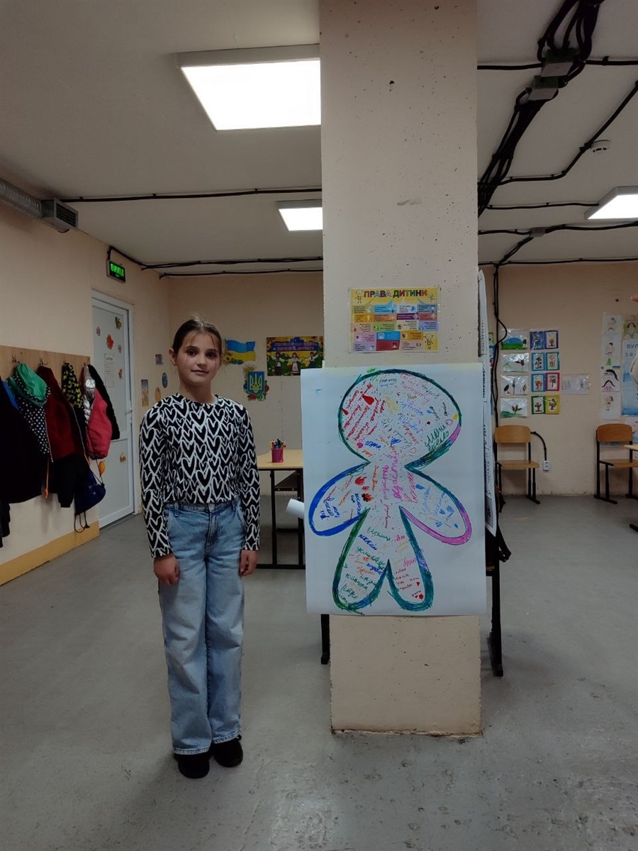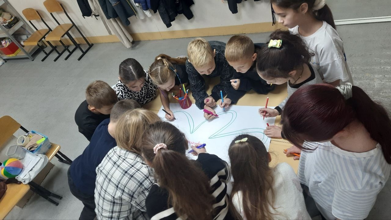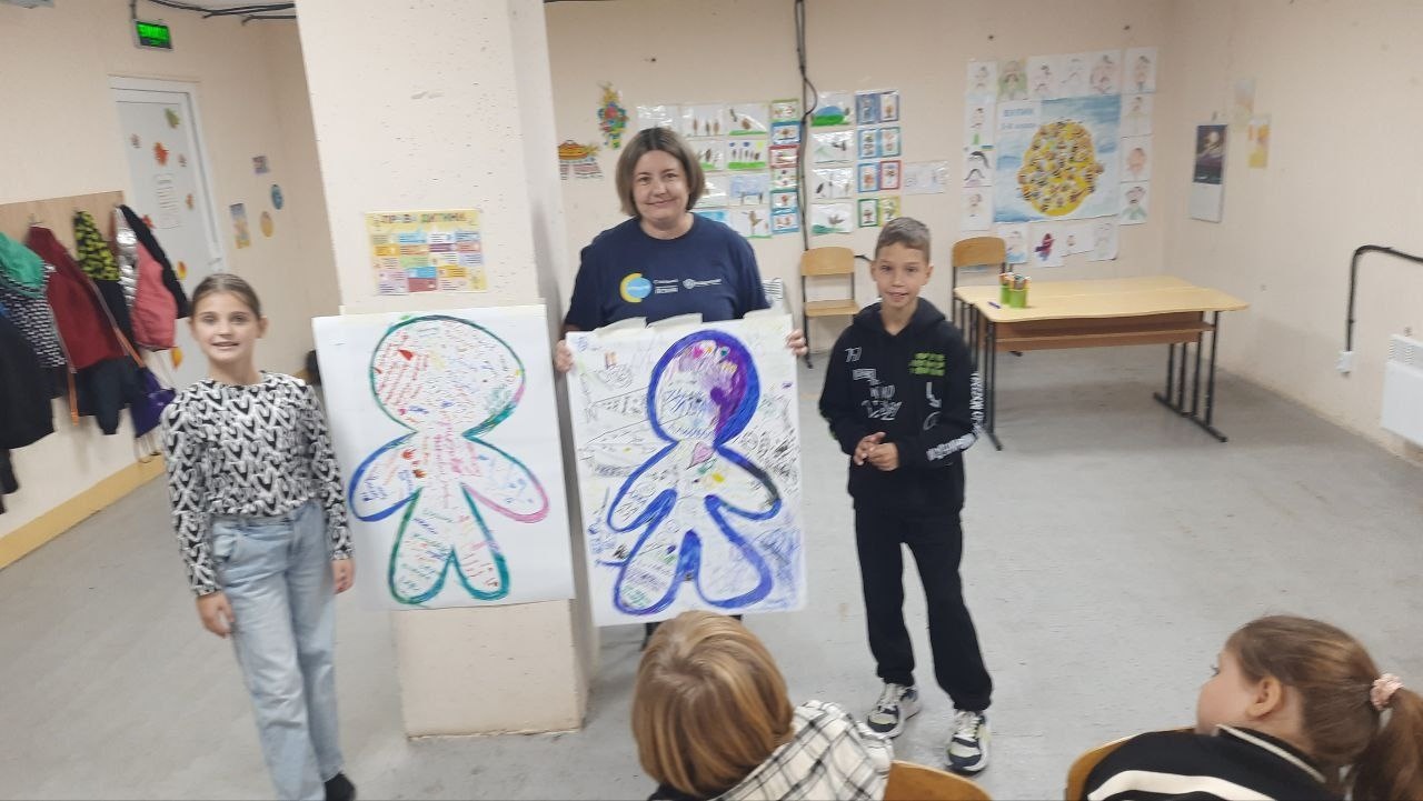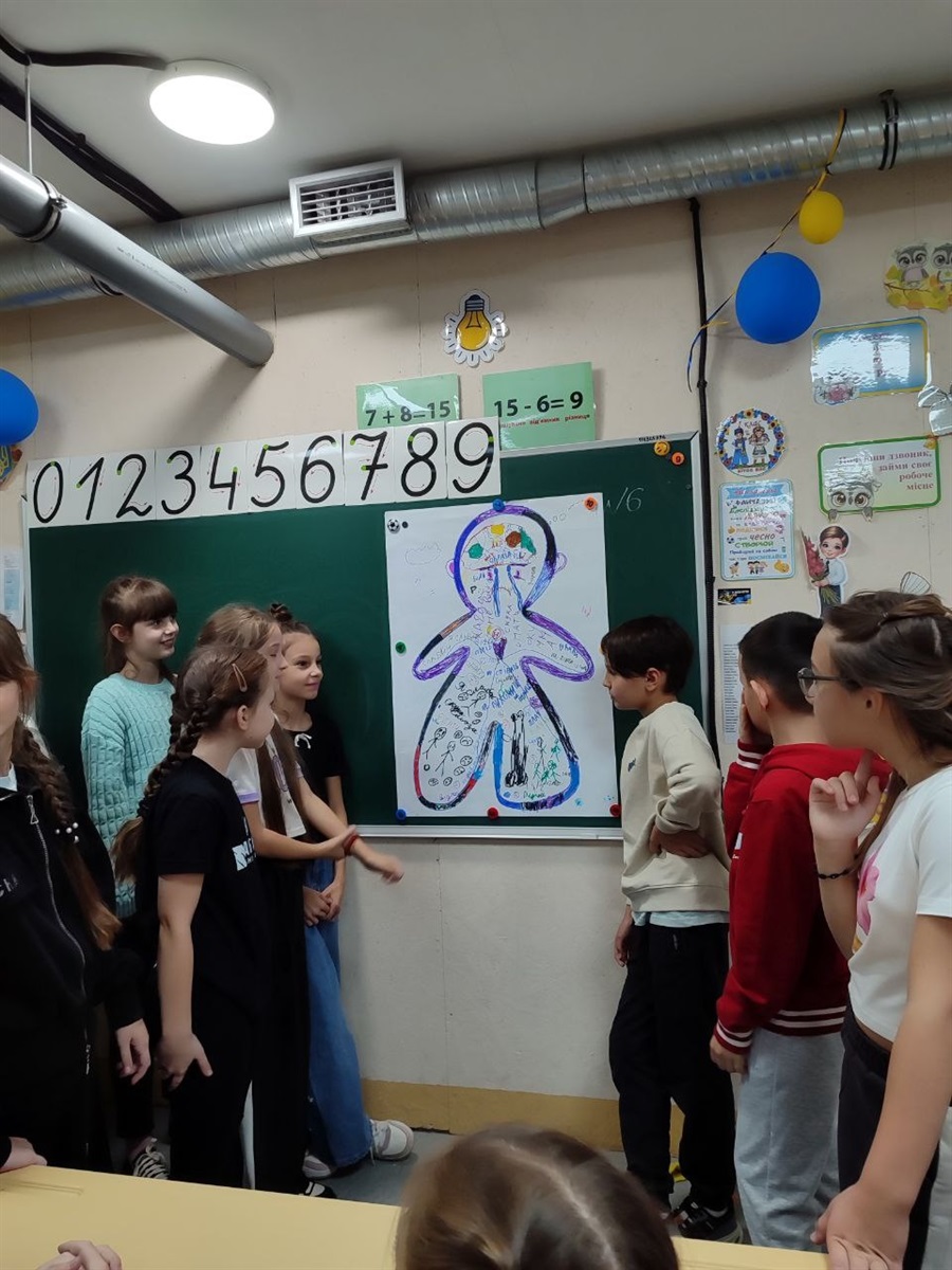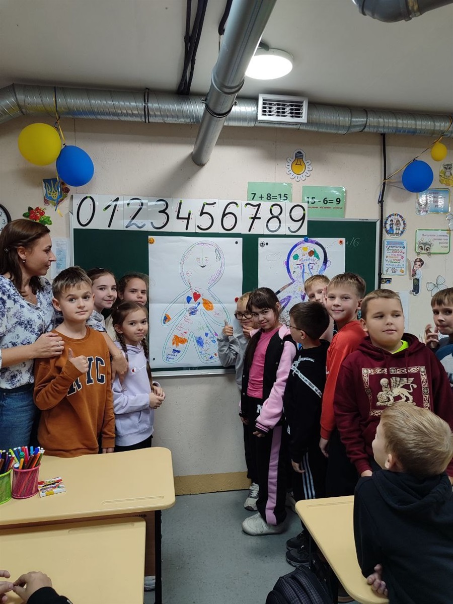 Для учнів 3–4 класів шкільний психолог Тетяна Олійник провела едукаційне заняття від Всеукраїнського громадського центру «Волонтер». Школярі створювали два силуети людини – зелений, який символізував «щасливу, впевнену в собі людину», та синій – «засмучену, пригнічену, тривожну». Разом аналізували, що такі люди відчувають, як поводяться, і які думки їх супроводжують, а також говорили про те, як емоції впливають на поведінку і чому важливо вчасно звертати увагу на свій внутрішній стан.