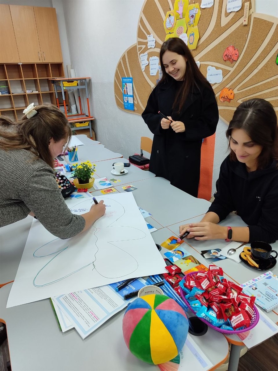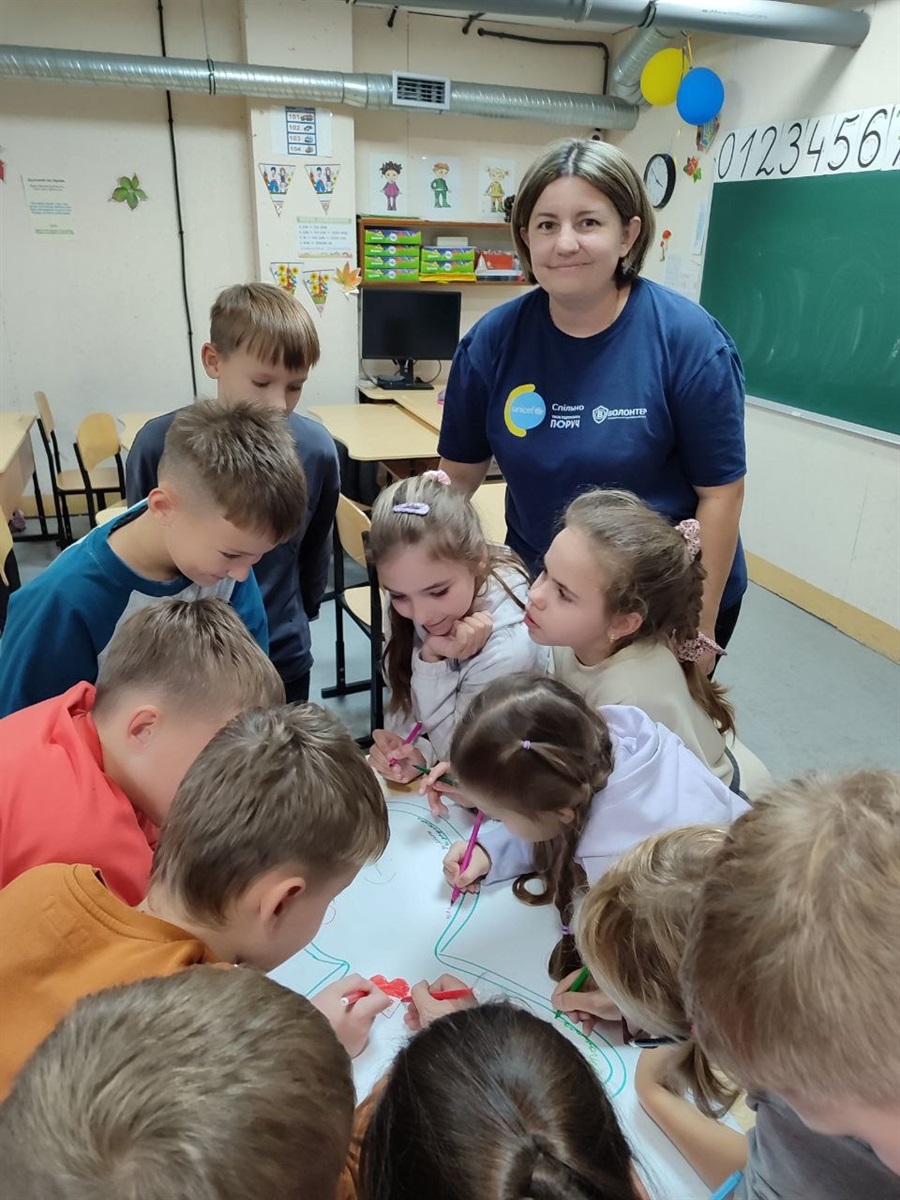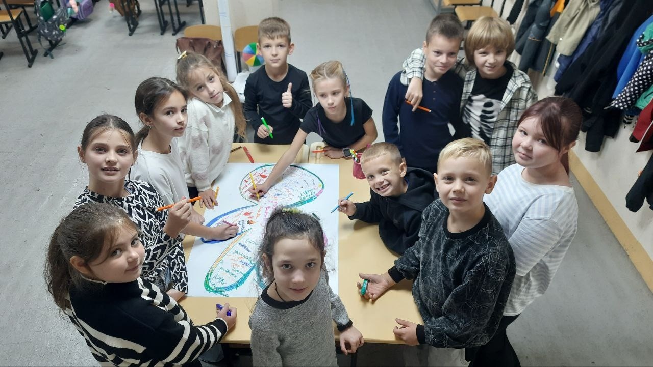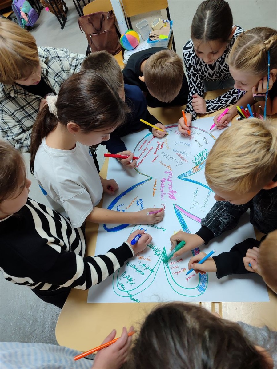 Для учнів 3–4 класів шкільний психолог Тетяна Олійник провела едукаційне заняття від Всеукраїнського громадського центру «Волонтер». Школярі створювали два силуети людини – зелений, який символізував «щасливу, впевнену в собі людину», та синій – «засмучену, пригнічену, тривожну». Разом аналізували, що такі люди відчувають, як поводяться, і які думки їх супроводжують, а також говорили про те, як емоції впливають на поведінку і чому важливо вчасно звертати увагу на свій внутрішній стан.