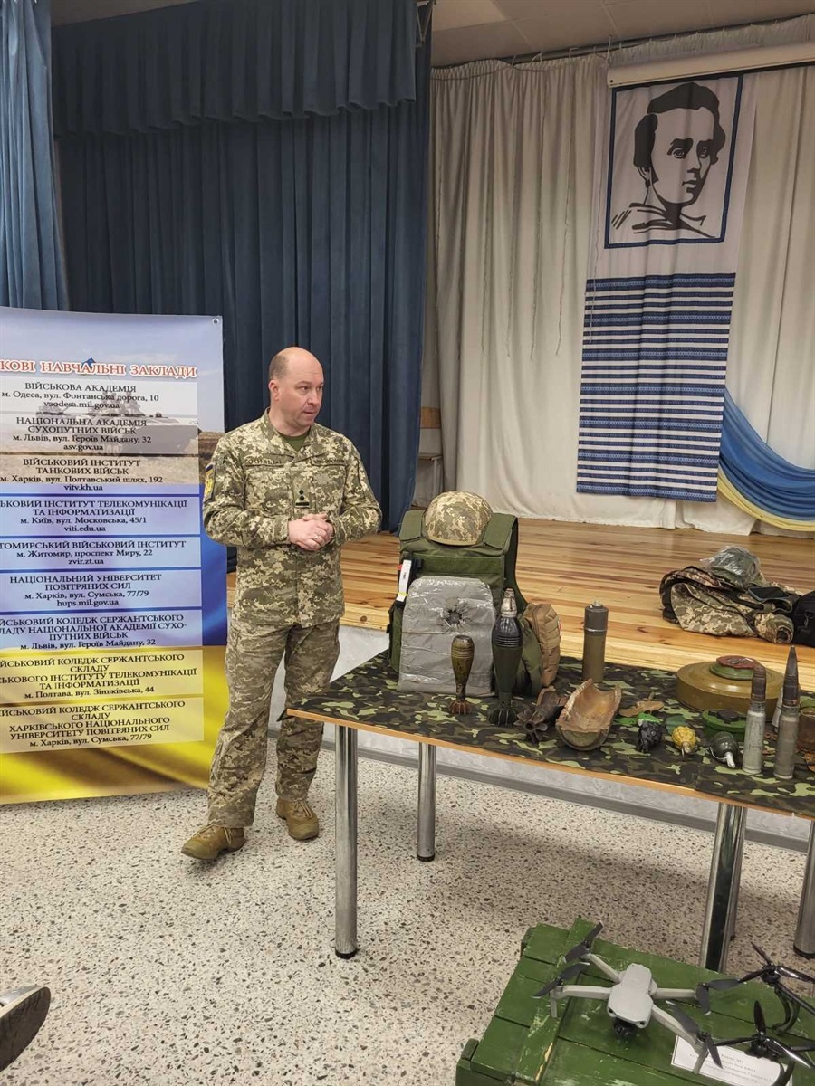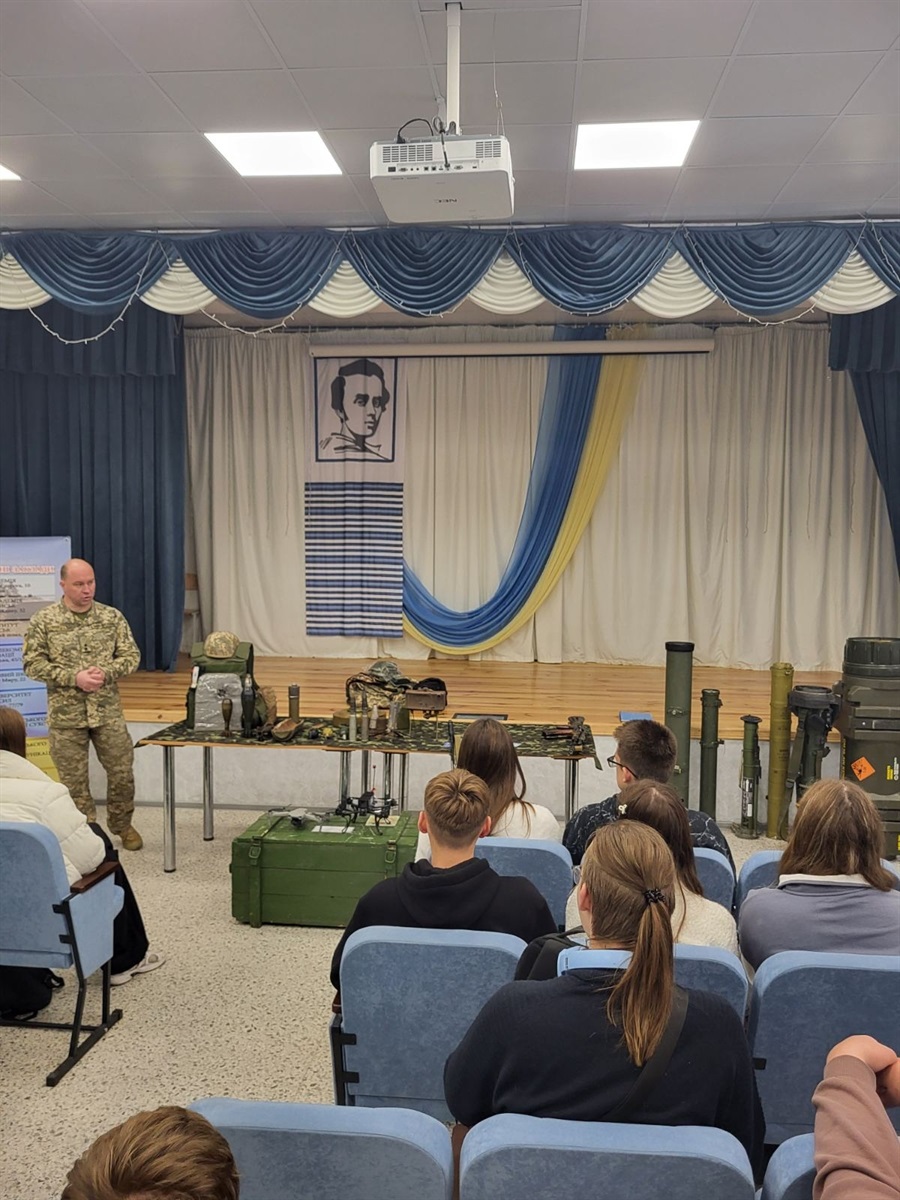 Особливий інтерес викликала практична частина зустрічі – демонстрація зразків озброєння, мін, військового спорядження та амуніції. Представники центру пояснили принцип дії різних типів зброї, розповіли про сучасні засоби захисту та важливість знань із безпеки під час роботи з ними.