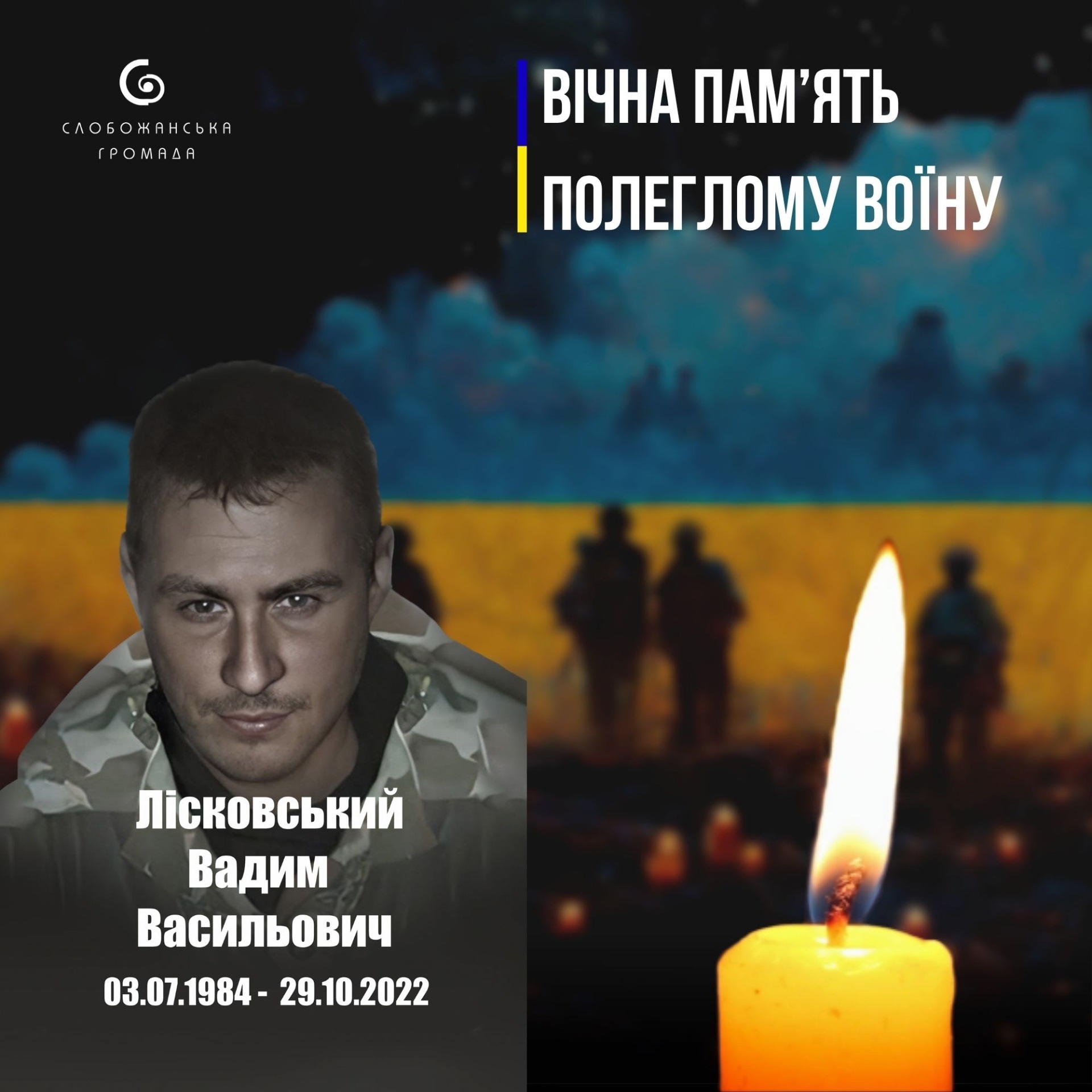 Сьогодні, 29 жовтня, минає третя річниця, як Слобожанська громада втратила мужнього воїна, захисника та Героя Вадима Лісковського. Це ім’я назавжди закарбоване в історії боротьби за незалежність України. Світла та вічна пам’ять Герою! Його самопожертва залишиться в серці кожного з нас назавжди.