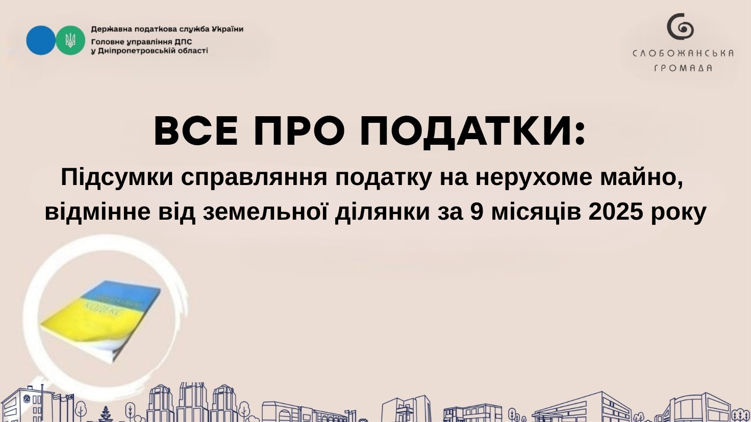 За даними ГУ ДПС у Дніпропетровській області за січень-вересень 2025 року суб’єктам господарювання та фізичним особам, що мають нерухомість на території Слобожанської ТГ, нараховано 31,1 млн грн податку на нерухоме майно, відмінне від земельної ділянки (у тому числі юридичним особам – 25,5 млн грн, фізичним особам/ФОП – 5,6 млн грн).