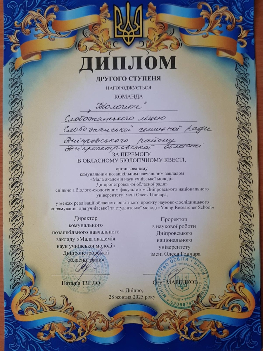 28 жовтня команда «БіоЛогіки» Слобожанського ліцею взяла участь в обласному біологічному квесті, який організували Дніпропетровське відділення Малої академії наук України спільно з біолого-екологічним факультетом ДНУ імені Олеся Гончара.