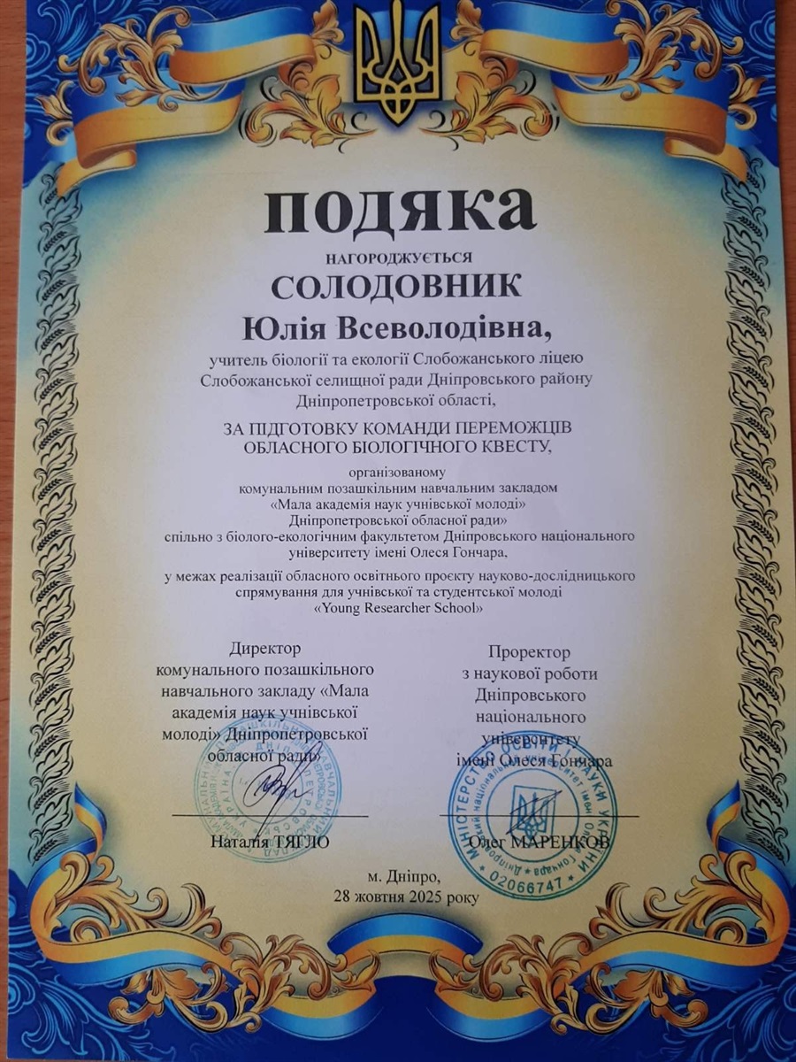 Особливі слова вдячності – вчителю біології та екології Юлії Солодовник, керівниці команди, яка отримала Подяку від керівництва МАН України та ДНУ ім. Олеся Гончара за професійну підготовку учнів і натхненне наставництво.