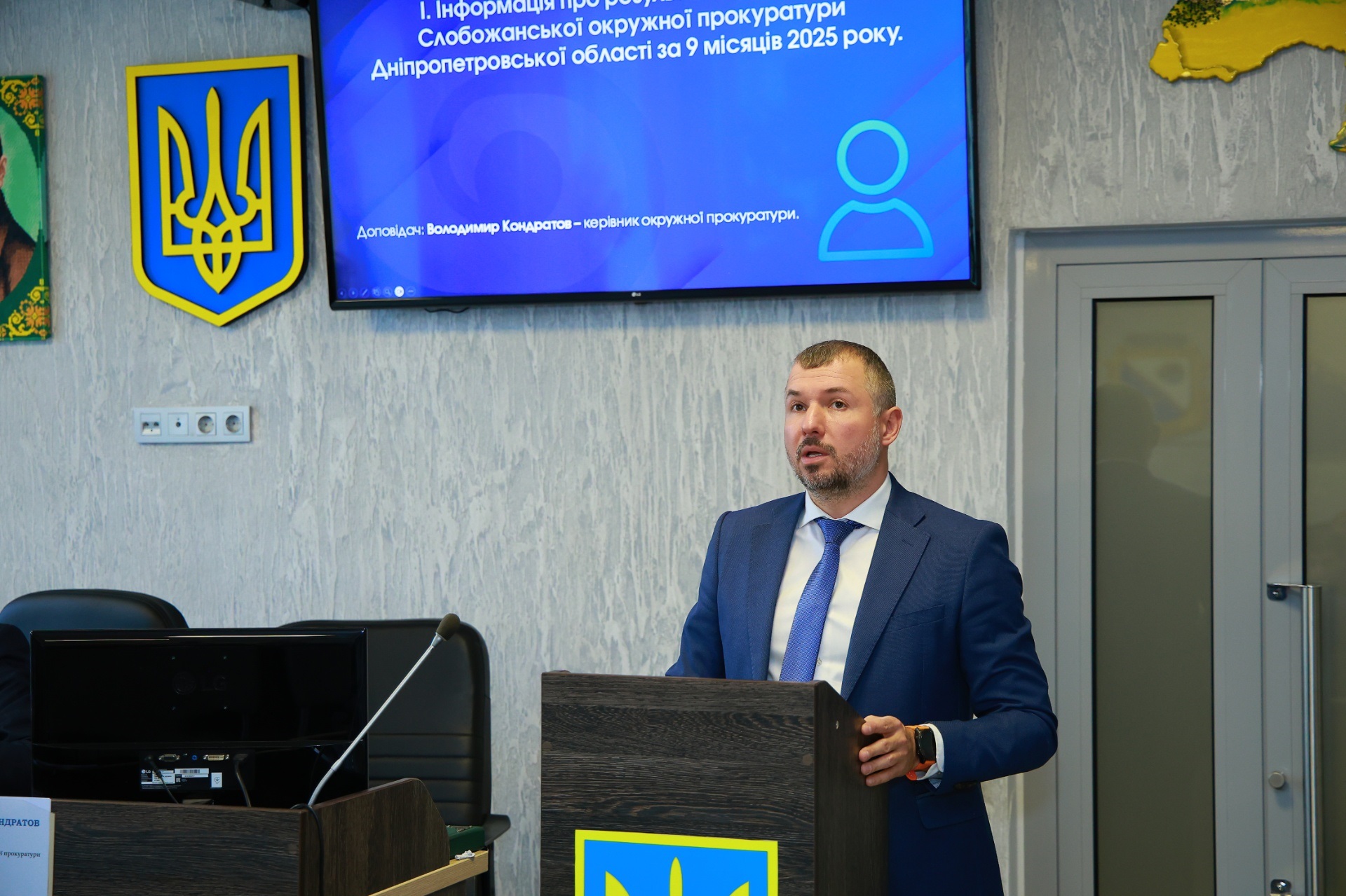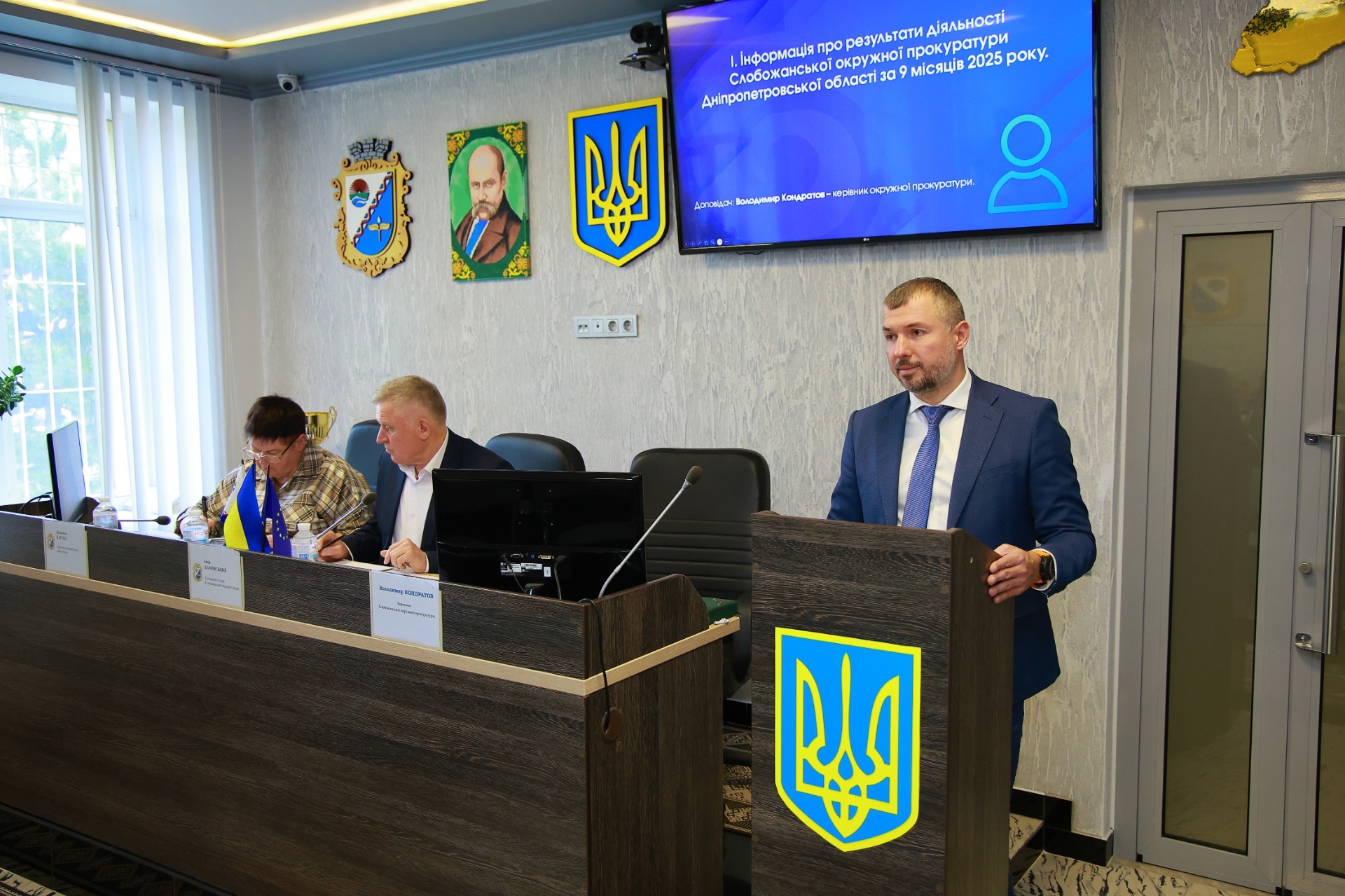 Після урочистої частини депутати перейшли до розгляду питань порядку денного. До участі в засіданні долучився керівник Слобожанської окружної прокуратури Дніпропетровської області Володимир Кондратов, який представив звіт про результати діяльності прокуратури за 9 місяців 2025 року.