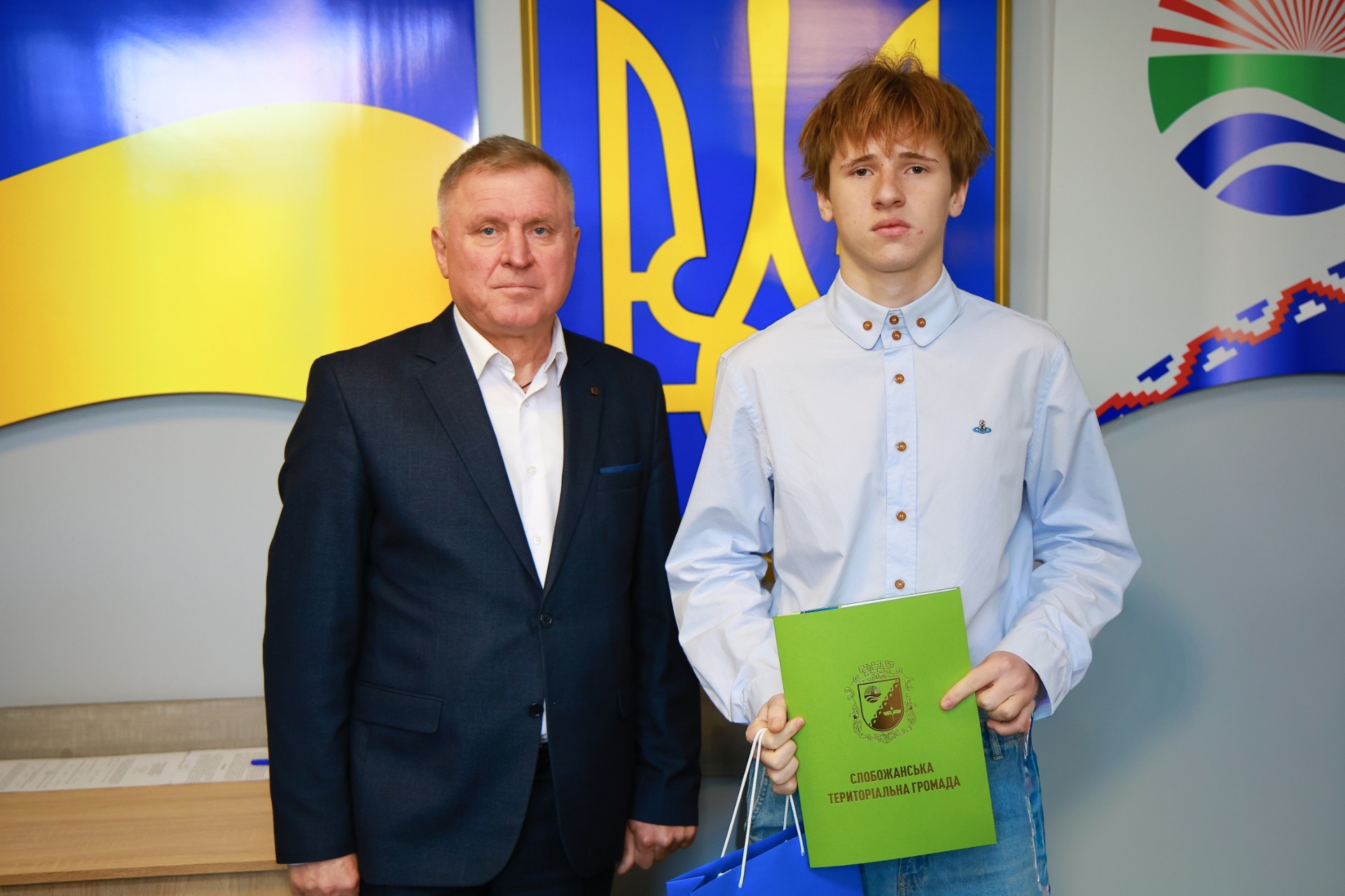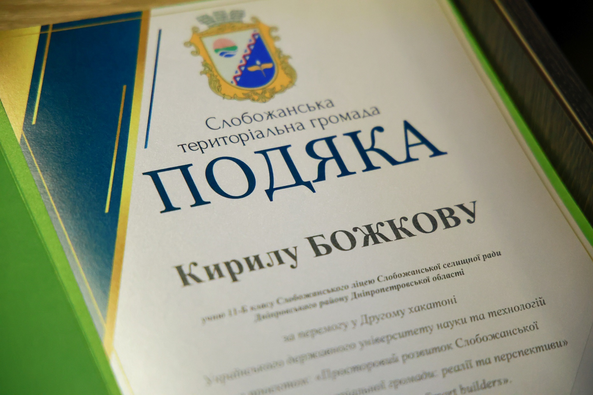 Також Подяками селищного голови відзначено команду «Smart builders» Слобожанського ліцею – переможців Другого хакатону Українського державного університету науки та технологій із проєктом «Просторовий розвиток Слобожанської громади: реалії та перспективи».