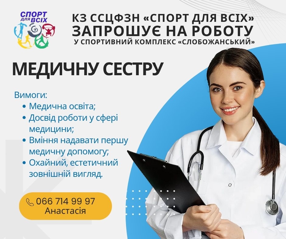 КЗ «Слобожанський селищний центр фізичного здоров’я населення «Спорт для всіх» шукає відповідального та уважного спеціаліста, який забезпечуватиме медичний супровід занять і змагань до спортивного комплексу «Слобожанський».