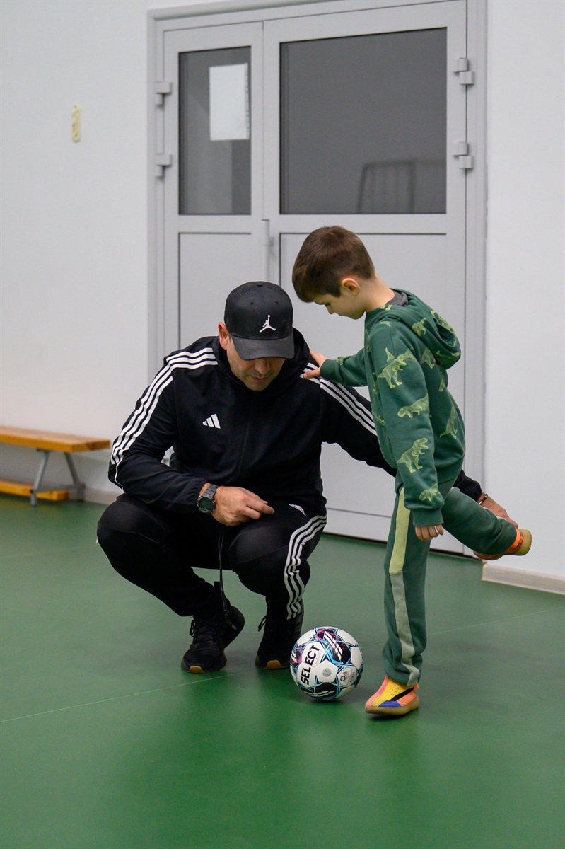 Тренер приділив індивідуальну увагу кожному учаснику, детально пропрацьовуючи ключові технічні моменти, зокрема постановку стопи під час удару, що має вирішальне значення у футзалі.