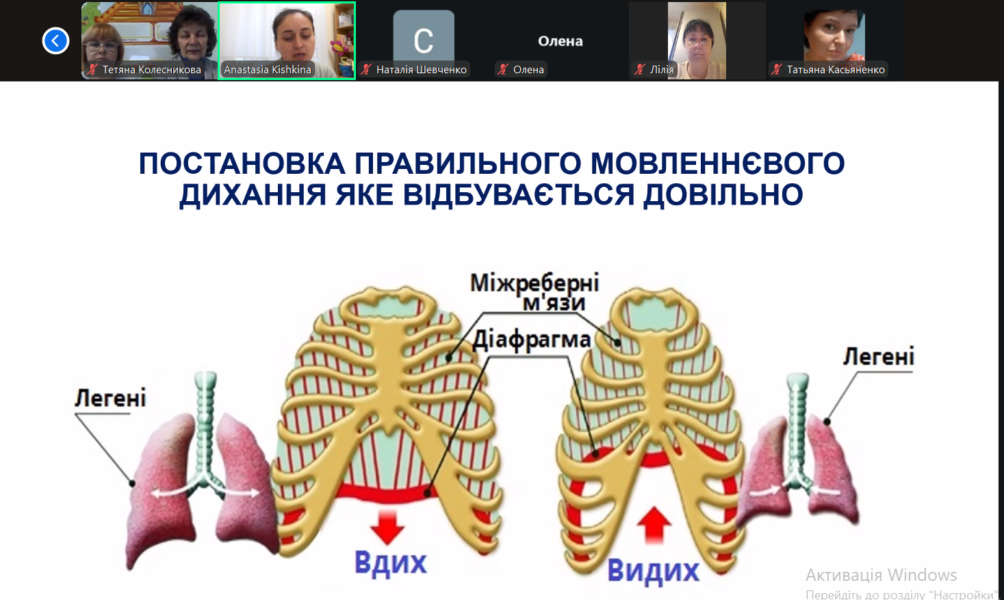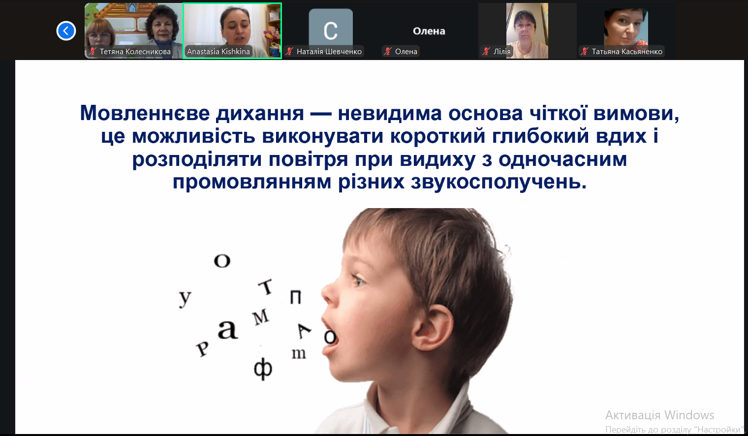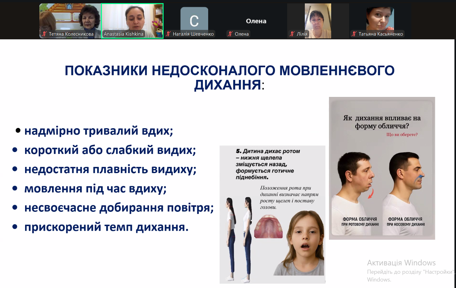 Яна Євгенівна наголосила на тому, що правильне мовленнєве дихання є основою чіткої та виразної звуковимови. Вона представила комплекс вправ на розвиток діафрагмального та мовленнєвого дихання, поділилася методичними рекомендаціями щодо їх щоденного використання та продемонструвала дихальні ігри, які легко адаптувати до занять з дітьми різного віку.