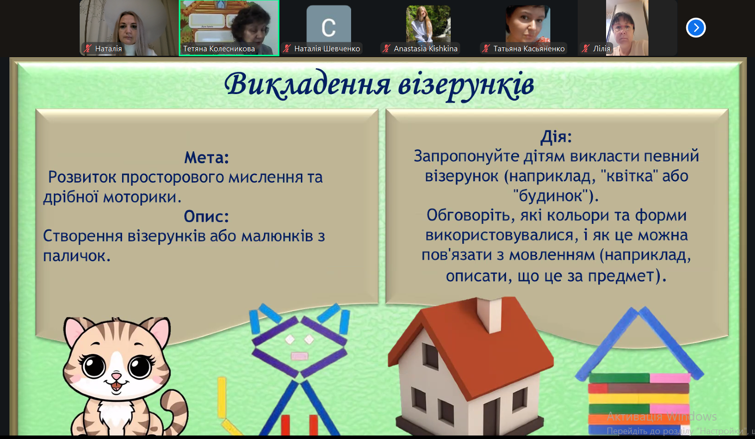 Пані Тетяна наголосила, що палички дозволяють поєднати логічно-математичний розвиток із мовленнєвими завданнями, сприяють формуванню граматичних структур, розширенню словника, розвитку просторових уявлень та комунікативних навичок. Тетяна Іванівна продемонструвала практичні вправи та ігрові прийоми, які логопеди можуть легко інтегрувати у щоденну роботу.