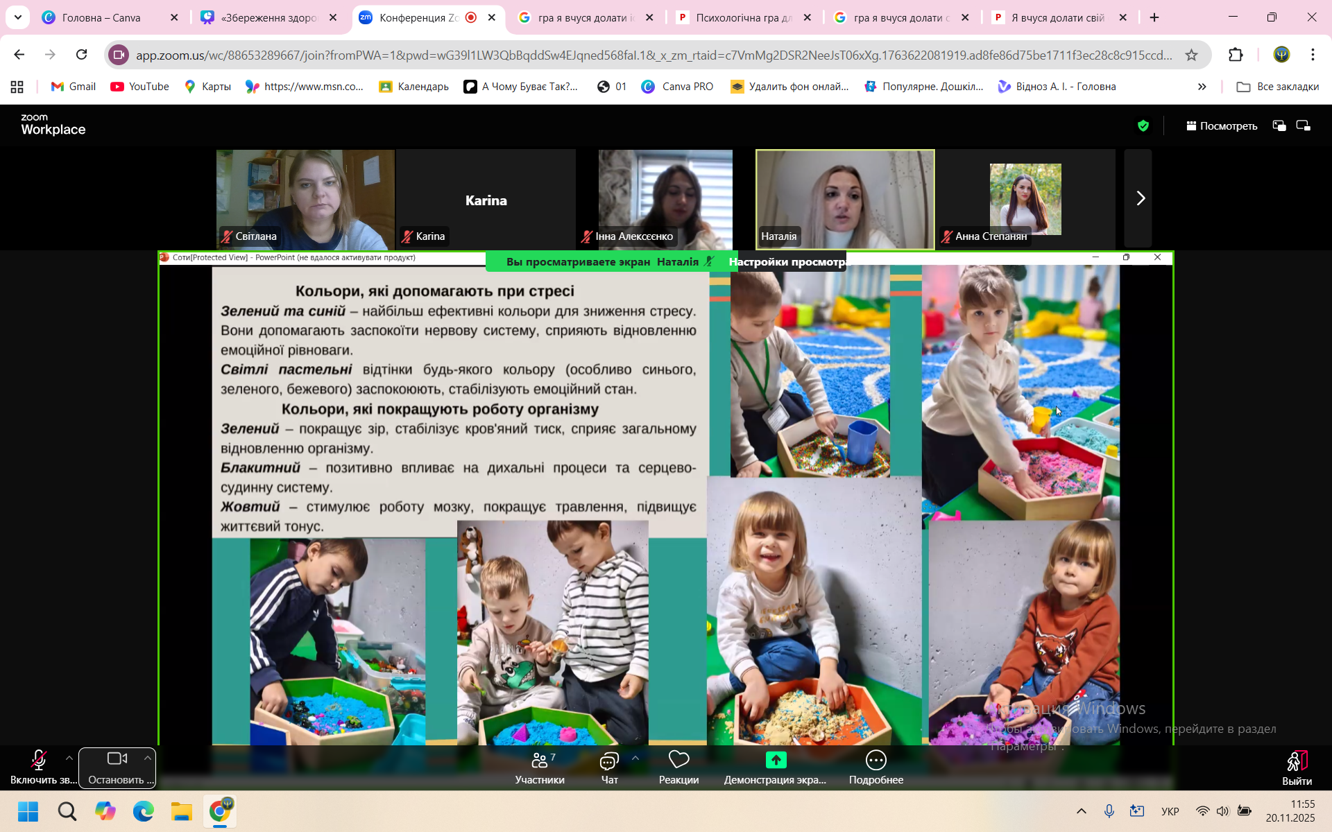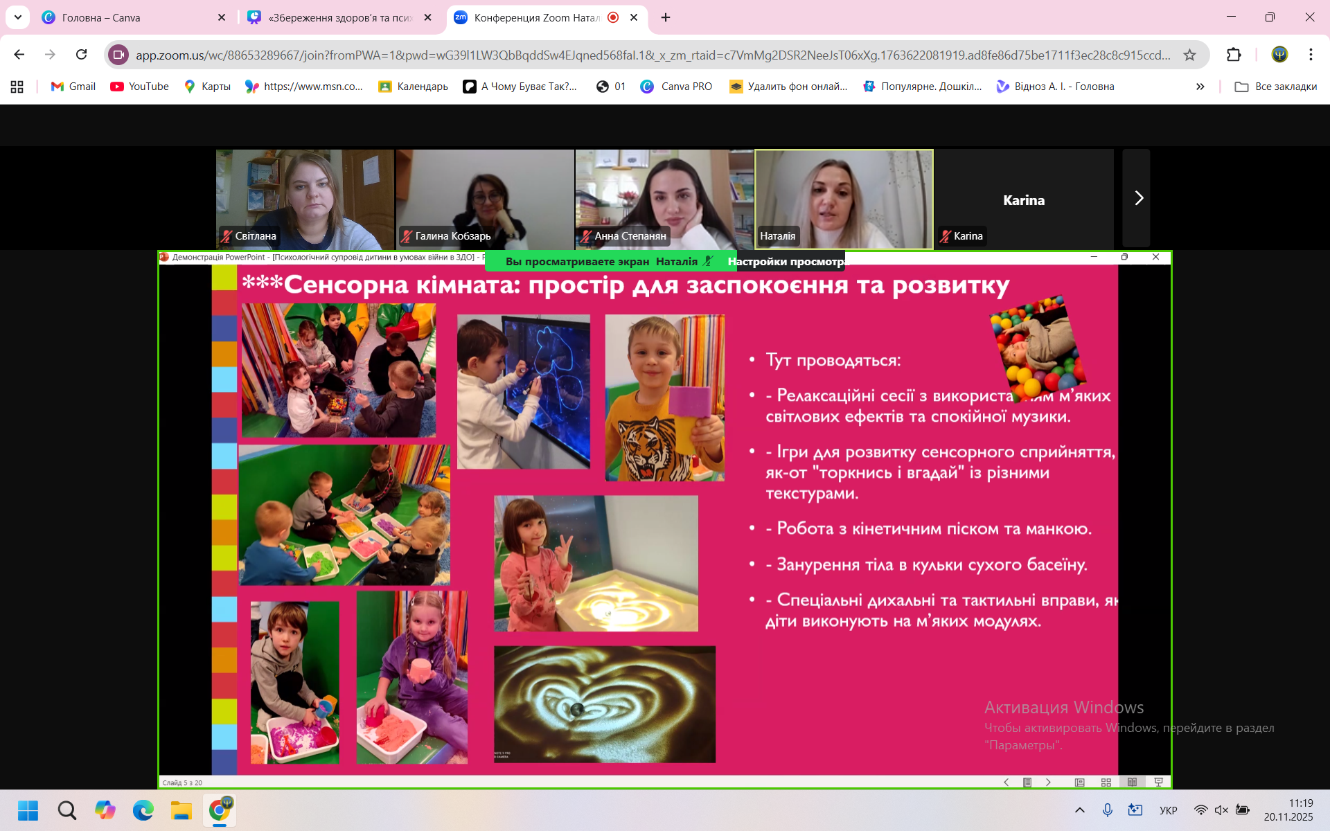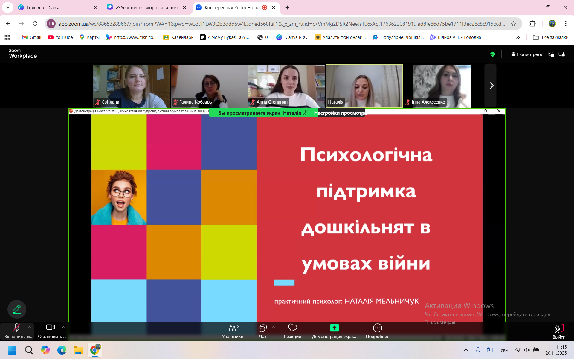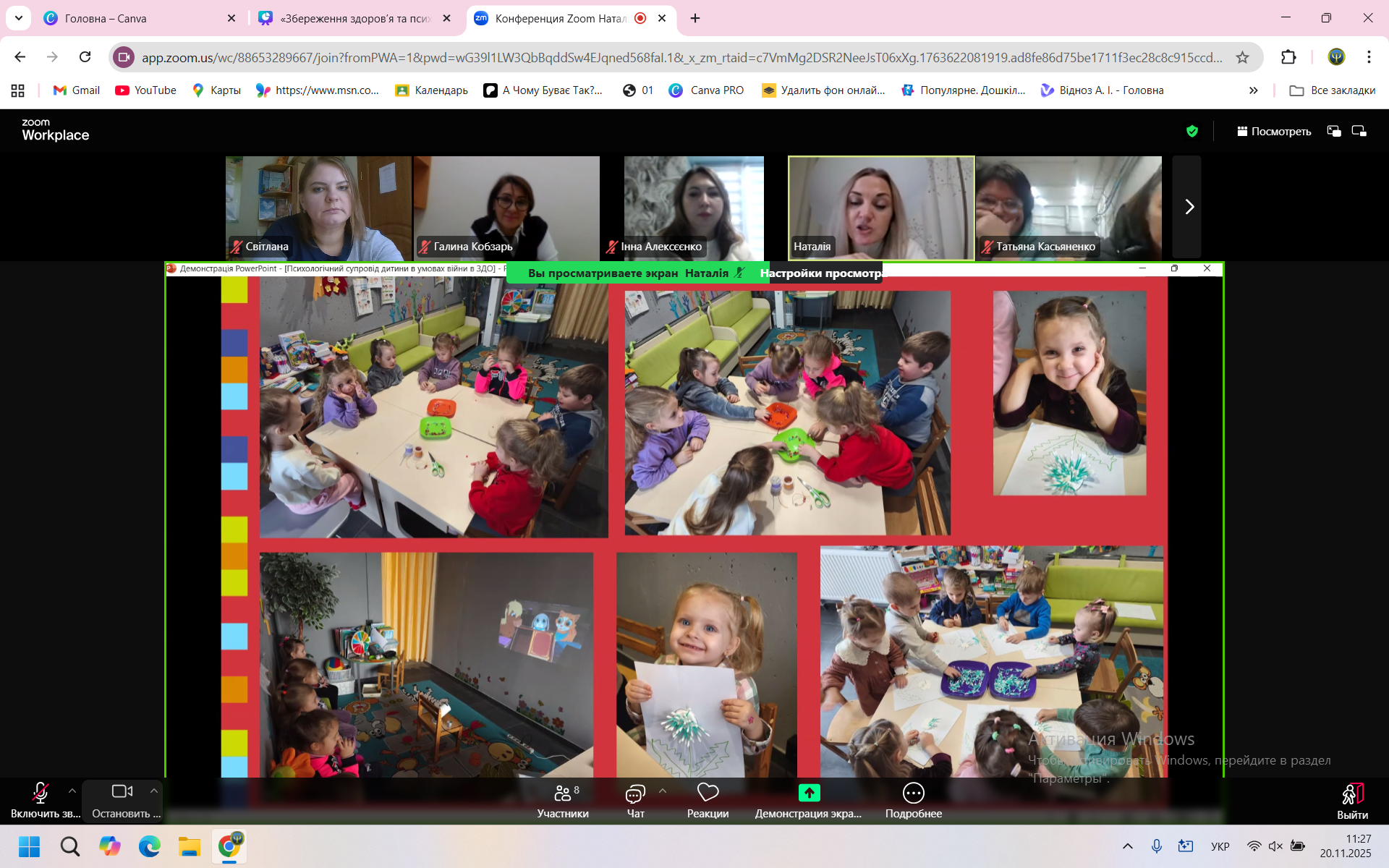 Питанню збереження внутрішнього ресурсу присвятила свій виступ Сафронова Світлана, практичний психолог ЗДО «Червона шапочка». Її доповідь «Збереження здоров?я та психологічного стану учасників освітнього процесу у воєнний та післявоєнний час» надала цінні рекомендації щодо самодопомоги та підтримки колег і батьків.