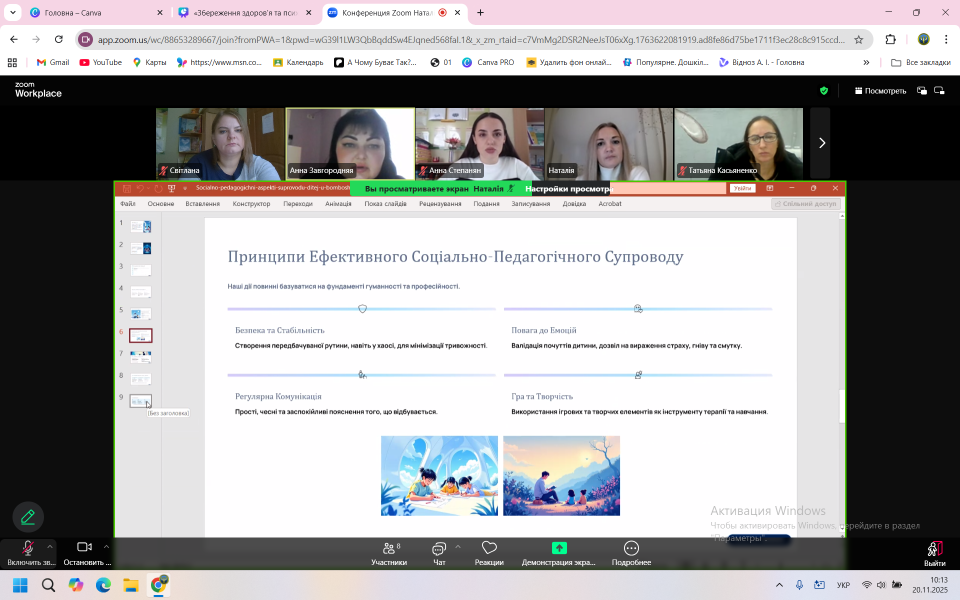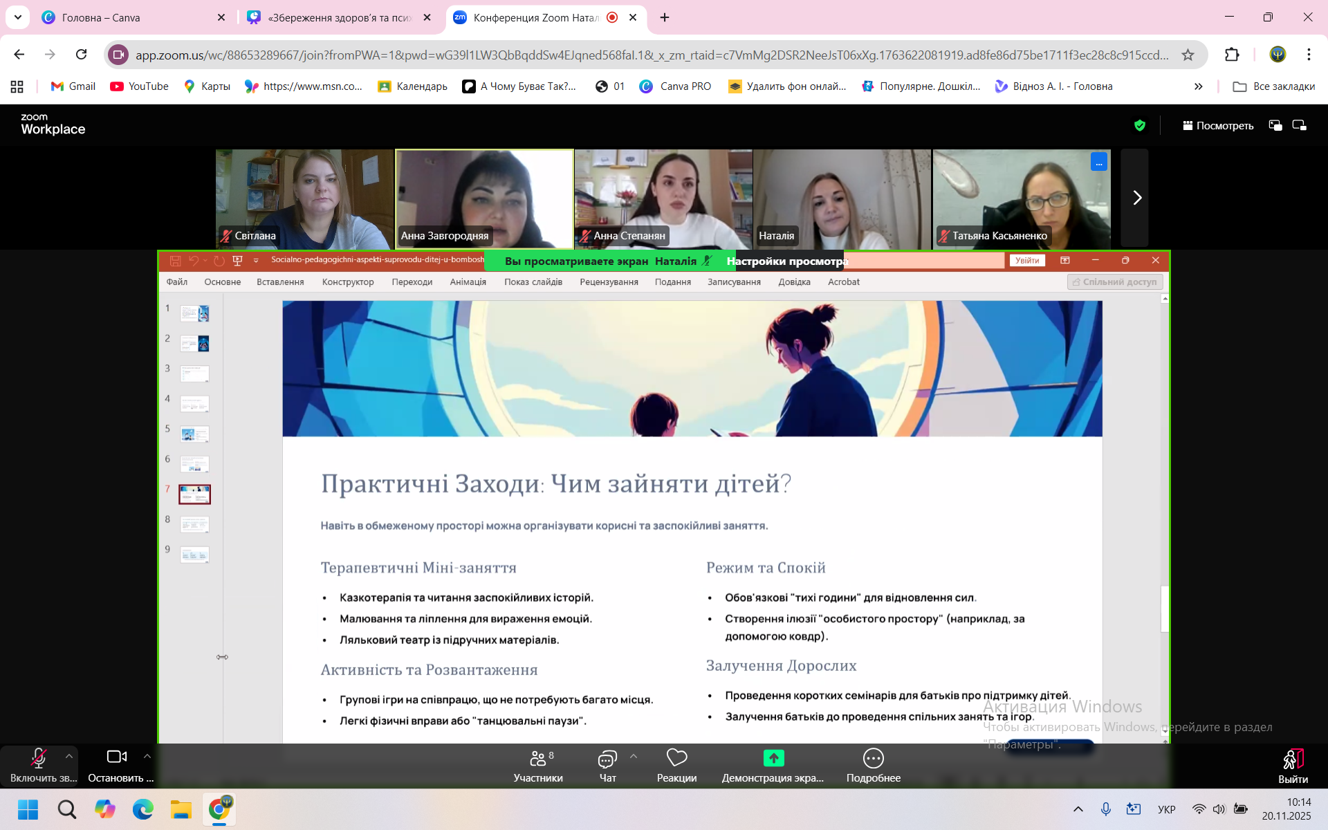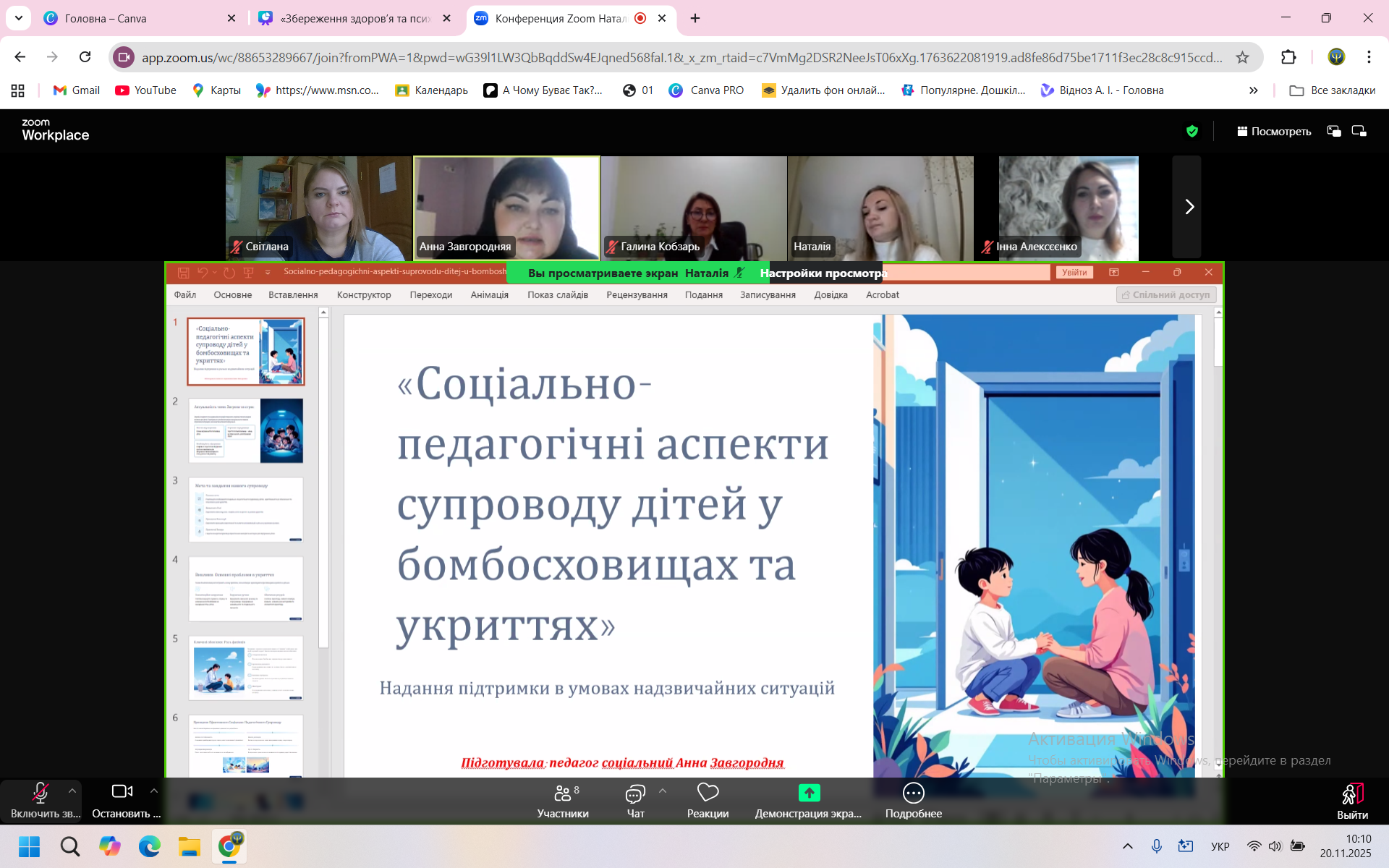 Про незамінну роль соціального педагога розповіла Степанян Анна, соціальний педагог ЗДО «Червона шапочка», презентувавши тему «Роль соціального педагога дошкільного закладу в умовах воєнного часу: підтримка дітей і родин». У фокусі були питання взаємодії з сім'ями, кризове консультування та налагодження зв'язків з громадою.