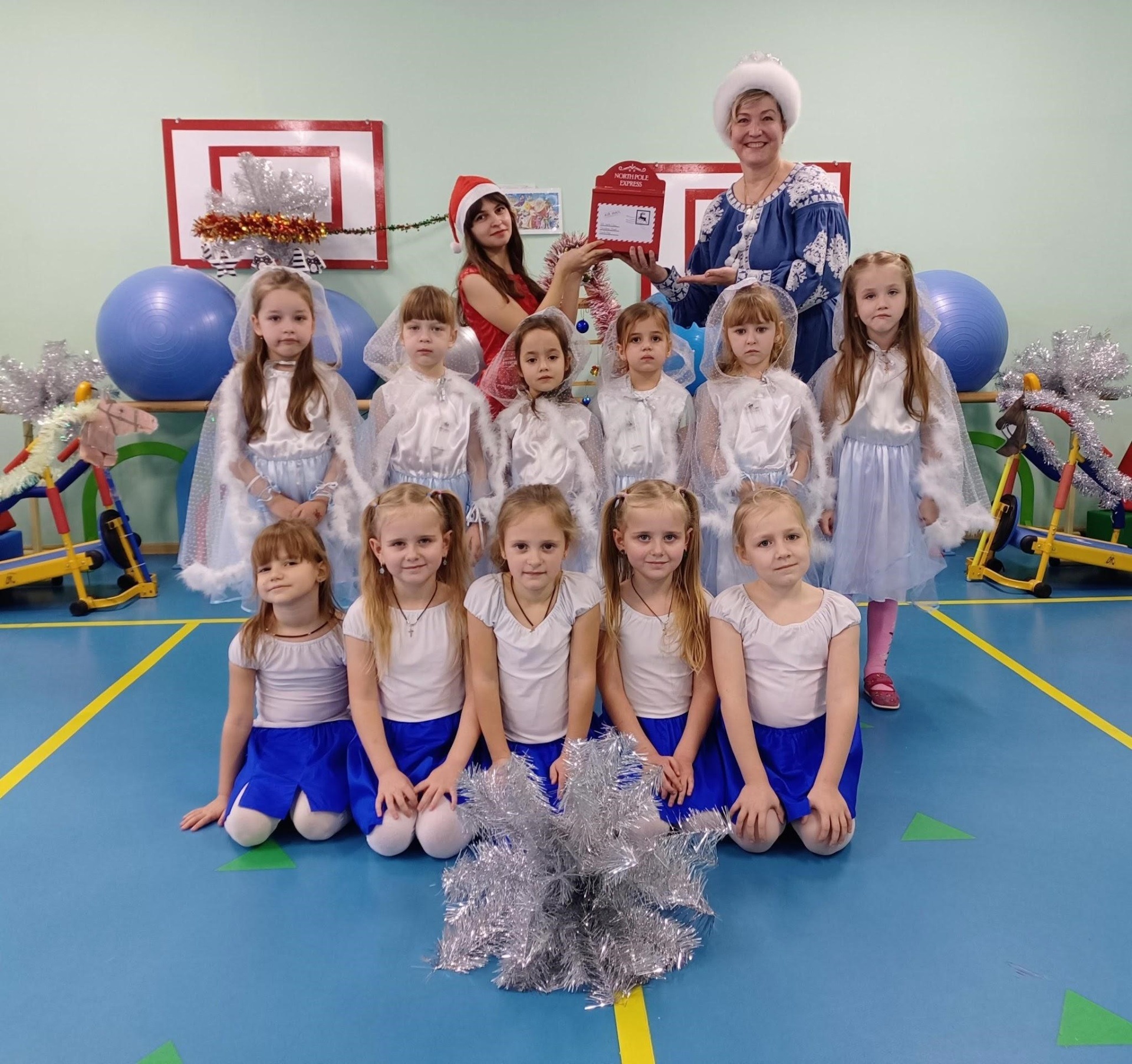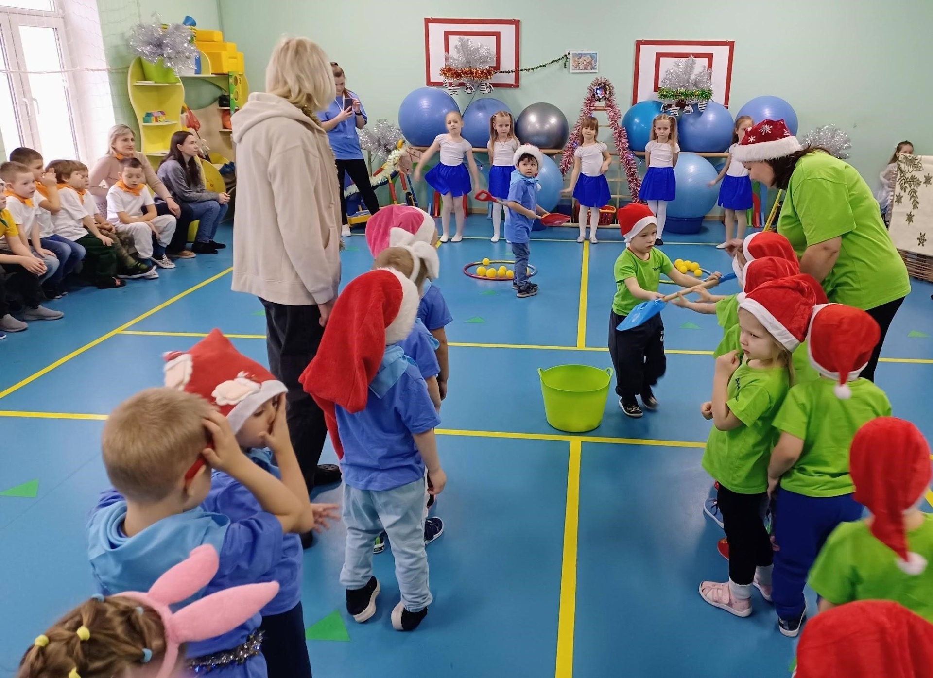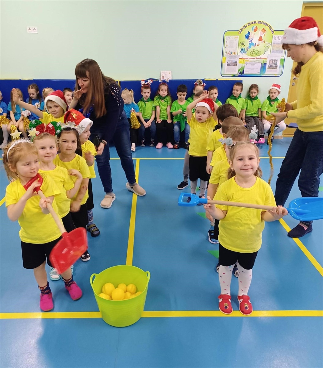 Чарівні снігові кулі (великі м’ячі для фітболу) від Королеви Зими вказали шлях до хатинки Святого Миколая, а вправно ними керували вихованці груп старшого дошкільного віку в ігровому змаганні «Кулі снігові прокоти – шлях до Миколая знайди!».