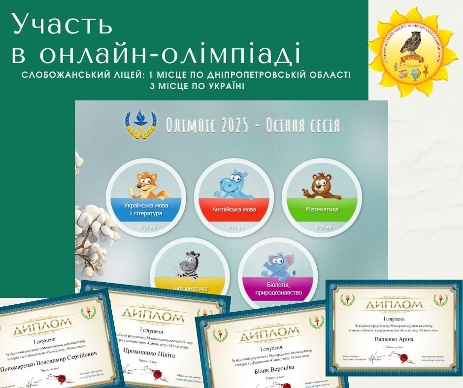 Слобожанський ліцей показав чудові результати в Міжнародному дистанційному конкурсі «Олімпіс» (осіння сесія), посівши: