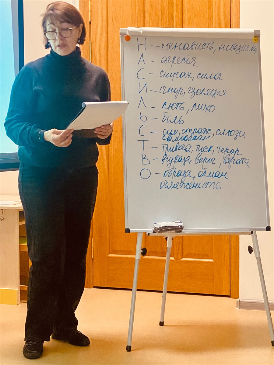 Особливу увагу було приділено розвінчанню хибних уявлень у суспільстві. За допомогою інтерактивної вправи «Міф чи правда» учасники спростували такі поширені міфи, як твердження, що насильство трапляється тільки в неблагополучних сім’ях, або що жертва сама його спровокувала своєю поведінкою. У результаті обговорення було чітко засвоєно, що відповідальність за насильство завжди лежить виключно на агресорі, а такі дії, як крики та образи, є формою психологічного насильства. Додаткова вправа «Асоціації зі словом НАСИЛЬСТВО» наочно підтвердила, що це явище завдає глибокої шкоди, викликаючи відчуття небезпеки, страху, тривоги та образи.