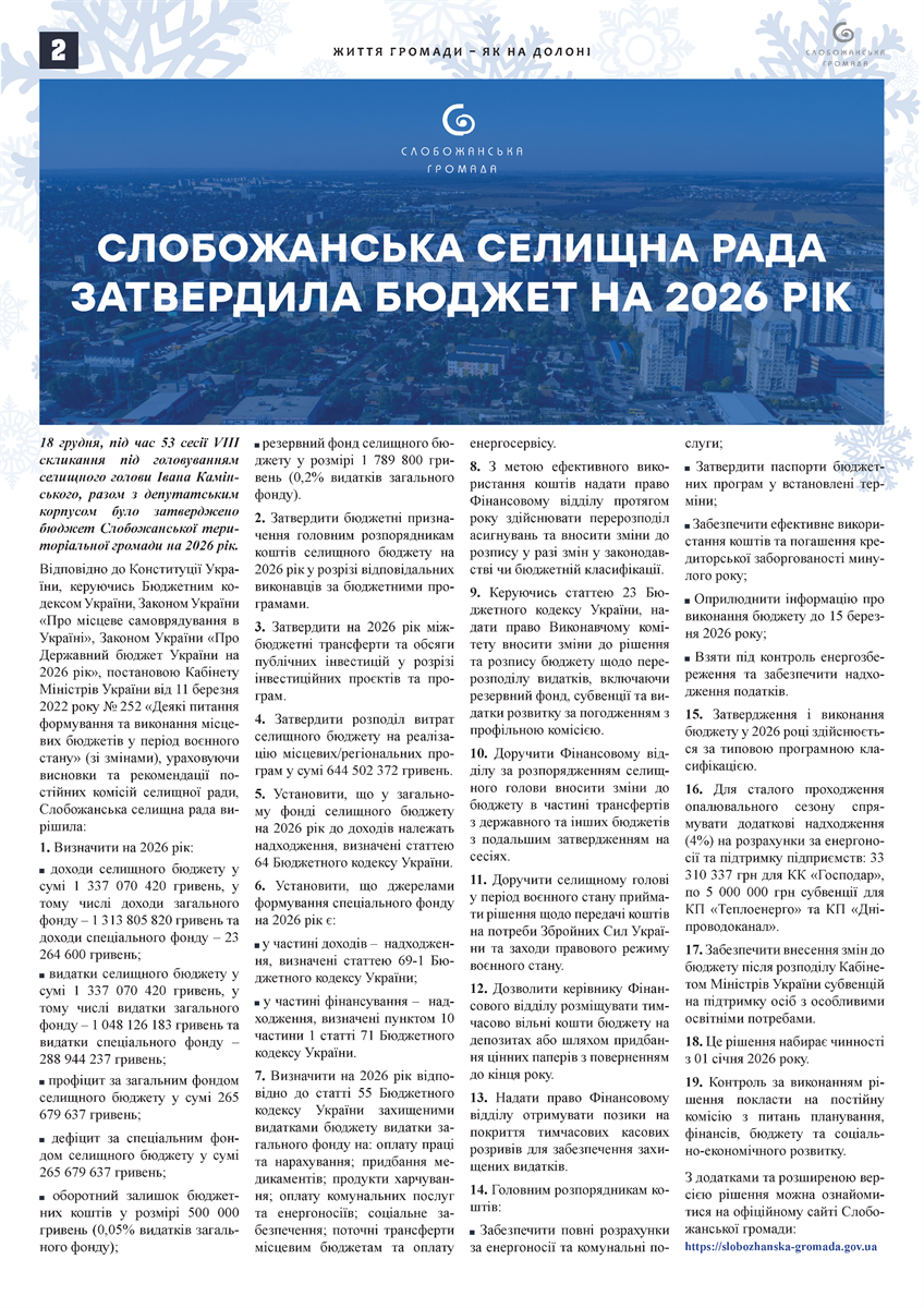 Вийшов грудневий випуск «Слобожанського Вісника» — підсумковий номер 2025 року, наповнений важливими подіями, рішеннями та святковим настроєм.