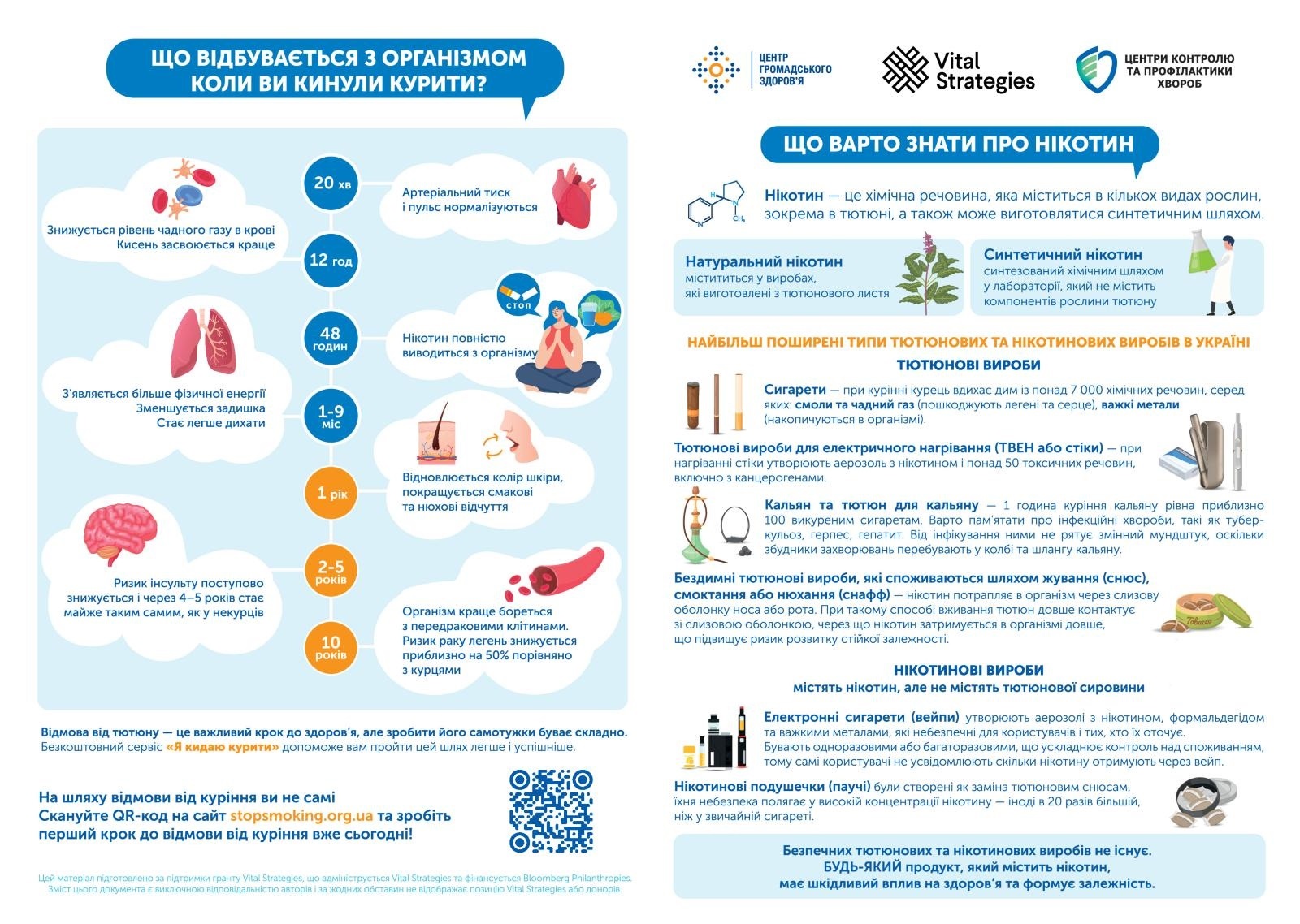 Центр громадського здоров’я МОЗ України (ЦГЗ) за підтримки Vital Strategies, Inc. спільно з експертами з громадського здоров’я при Українському католицькому університеті та лікарями розробив посібник «Розвиток напряму надання допомоги у відмові від куріння на рівні громади». Він призначений для фахівців громадського здоров’я та соціальної роботи, але також буде корисним лідерам громад, освітянам, представникам місцевої влади та всім, хто прагне створювати здорове середовище у своїх громадах.