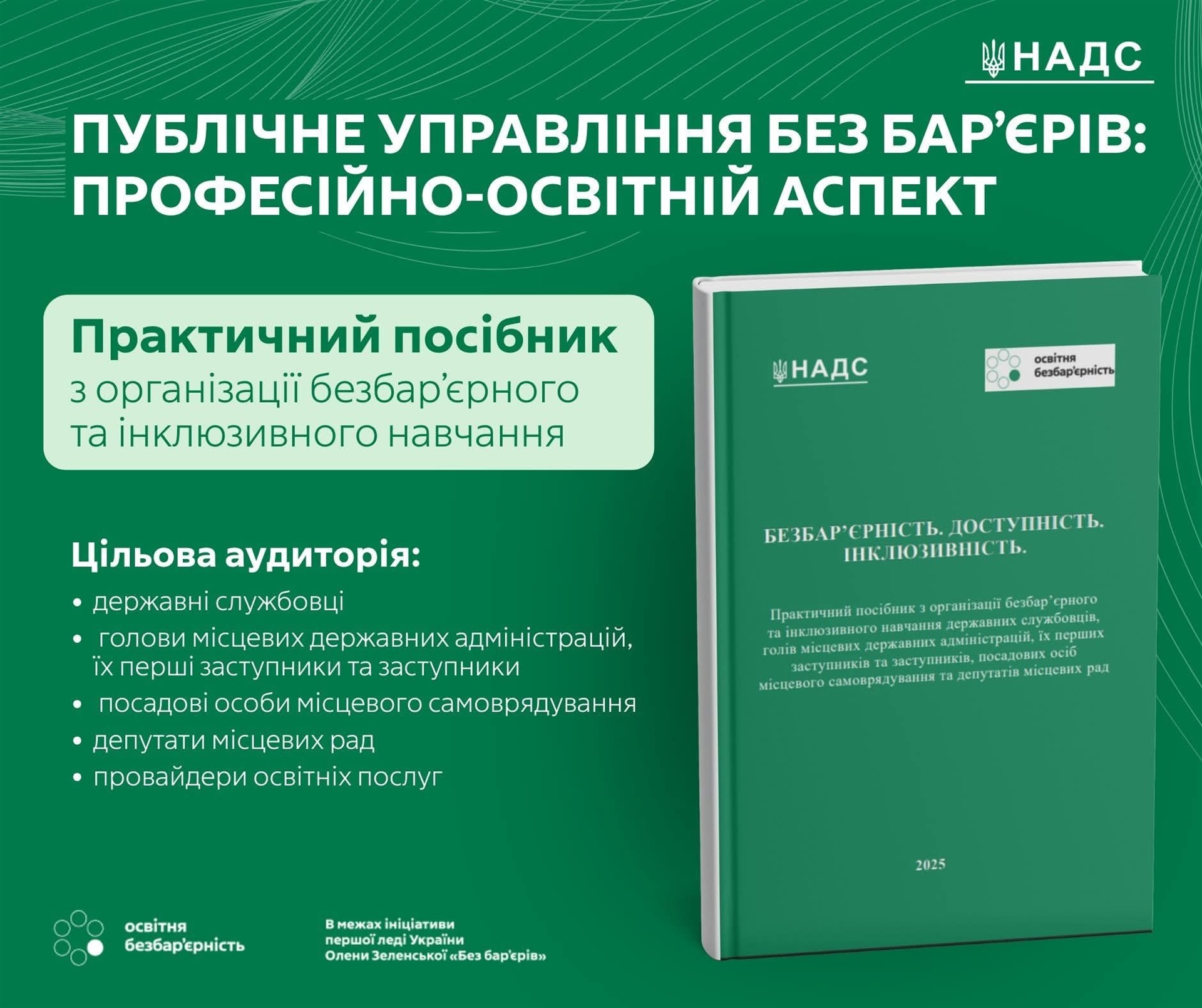 Безбар’єрність у публічному управлінні неможлива без доступного та інклюзивного навчання. Саме тому у межах флагманського проєкту НАДС «Публічне управління без бар?єрів» підготовлено Практичний посібник з організації безбар’єрного та інклюзивного навчання.
