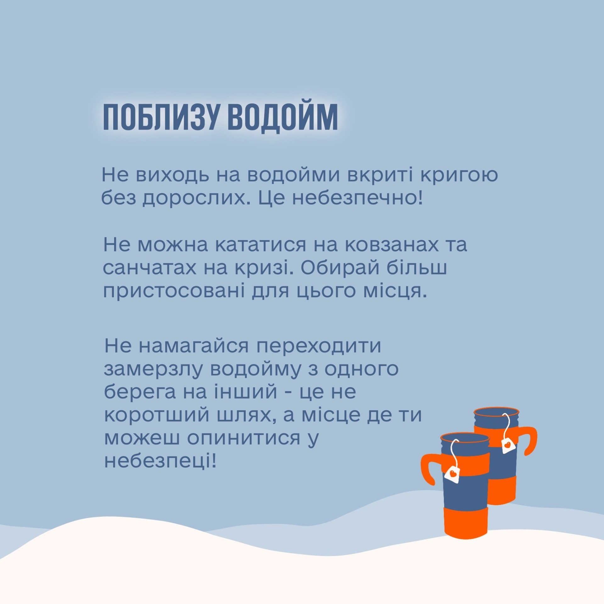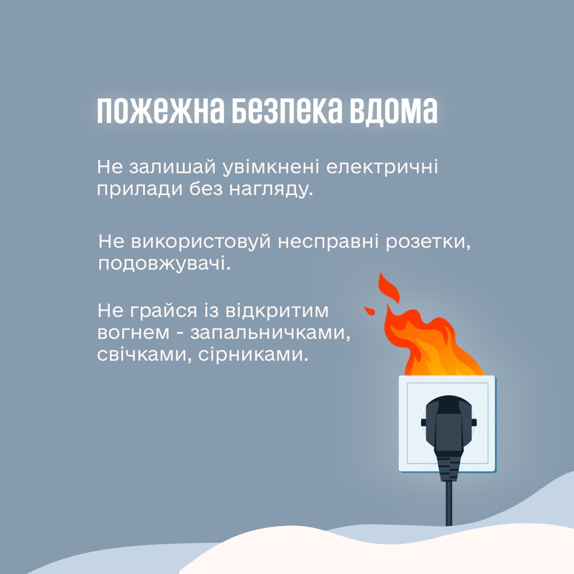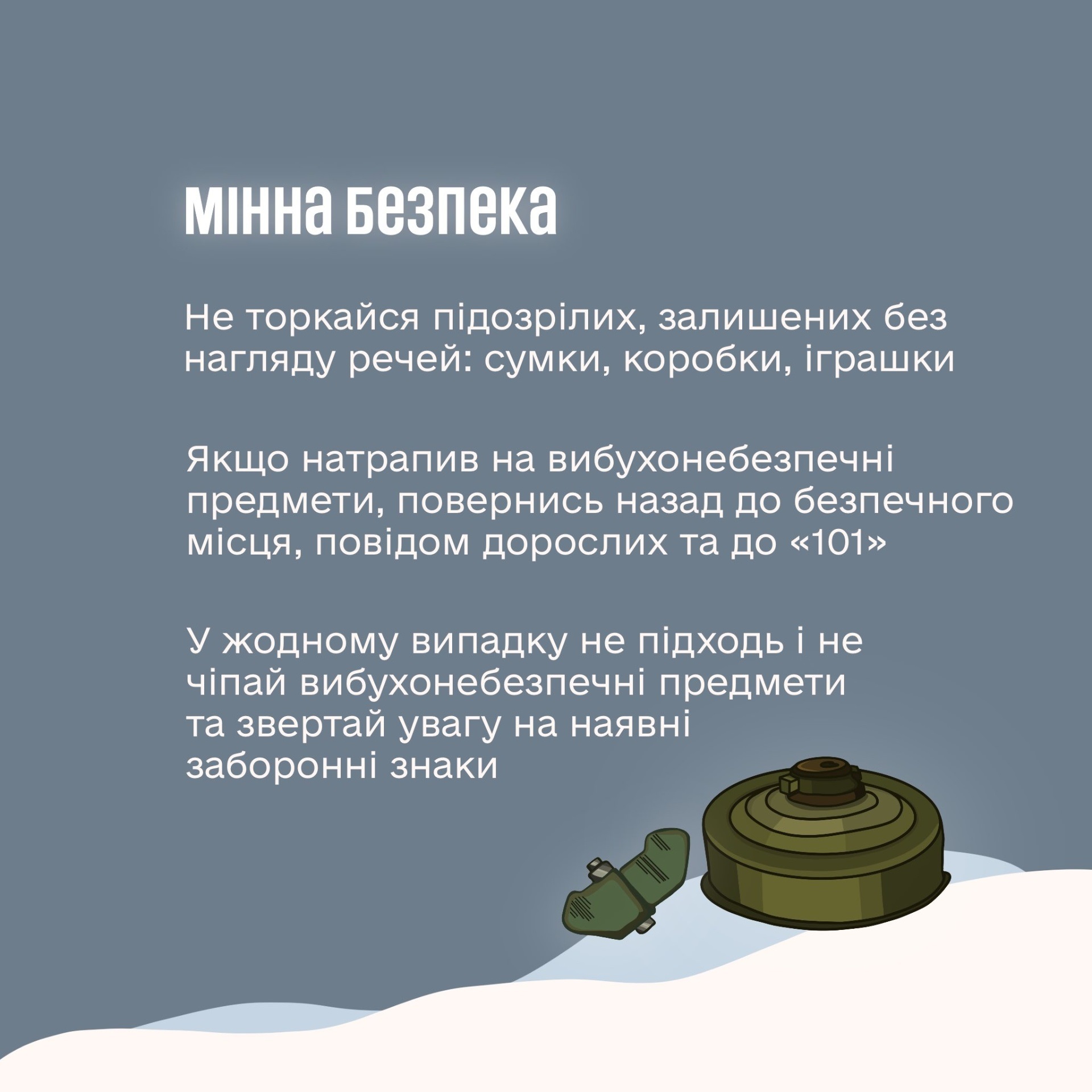Окрім правил дорожнього руху та поводження на льоду, суворо дотримуйтеся алгоритму дій під час повітряної тривоги та правил мінної безпеки. Також будьте вкрай обережними з вогнем, електроприладами та альтернативними джерелами світла вдома. Бережіть себе та своїх близьких!
