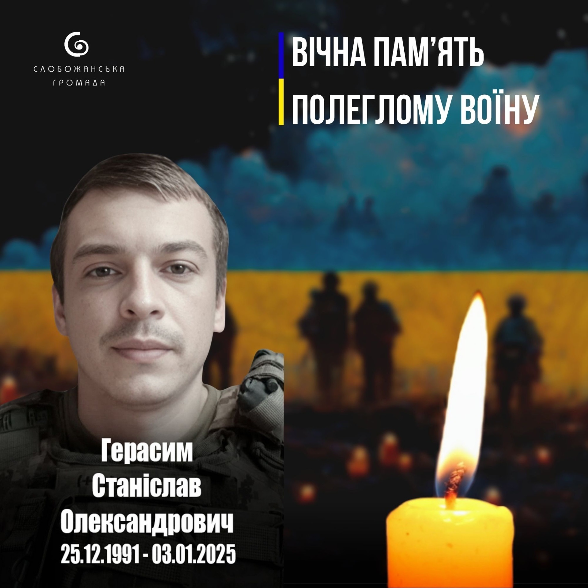 Сьогодні, 3 січня, минає перша річниця, як Слобожанська громада втратила мужнього воїна, захисника та Героя Станіслава Герасима. Це ім’я назавжди закарбоване в історії боротьби за незалежність України. Світла та вічна пам’ять Герою! Його самопожертва залишиться в серці кожного з нас назавжди.