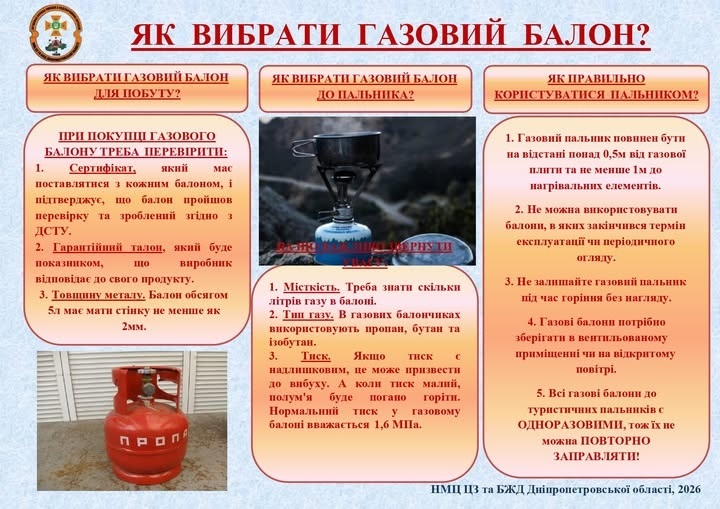 Матеріал містить основні вимоги до вибору газових балонів та правила безпечного користування в побуті.