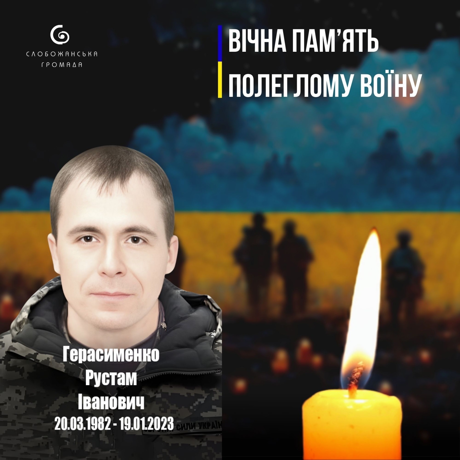 Сьогодні, 19 січня, минає третя річниця, як Слобожанська громада втратила мужнього воїна, захисника та Героя Рустама Герасименка. Це ім’я назавжди закарбоване в історії боротьби за незалежність України. Світла та вічна пам’ять Герою! Його самопожертва залишиться в серці кожного з нас назавжди.