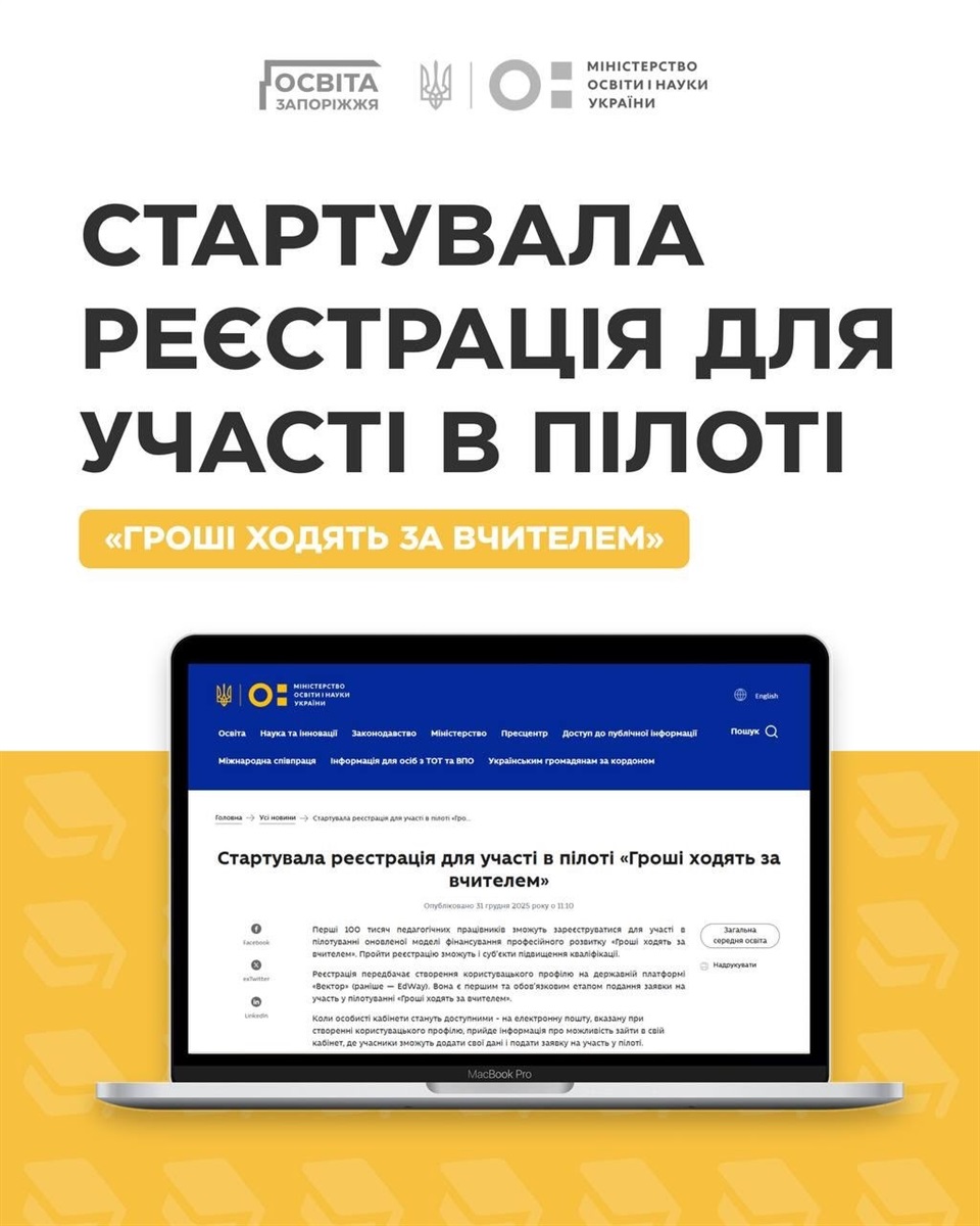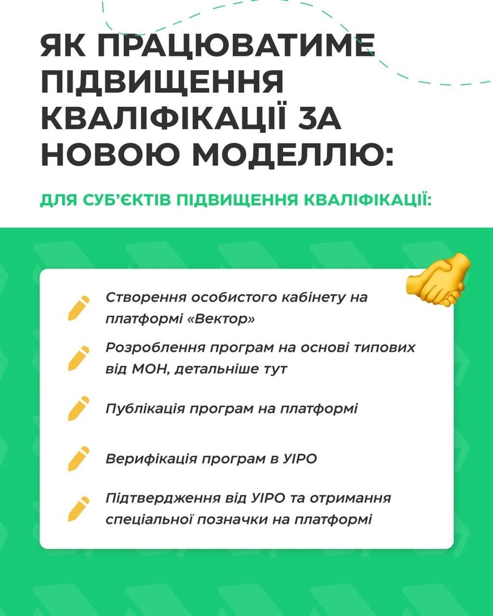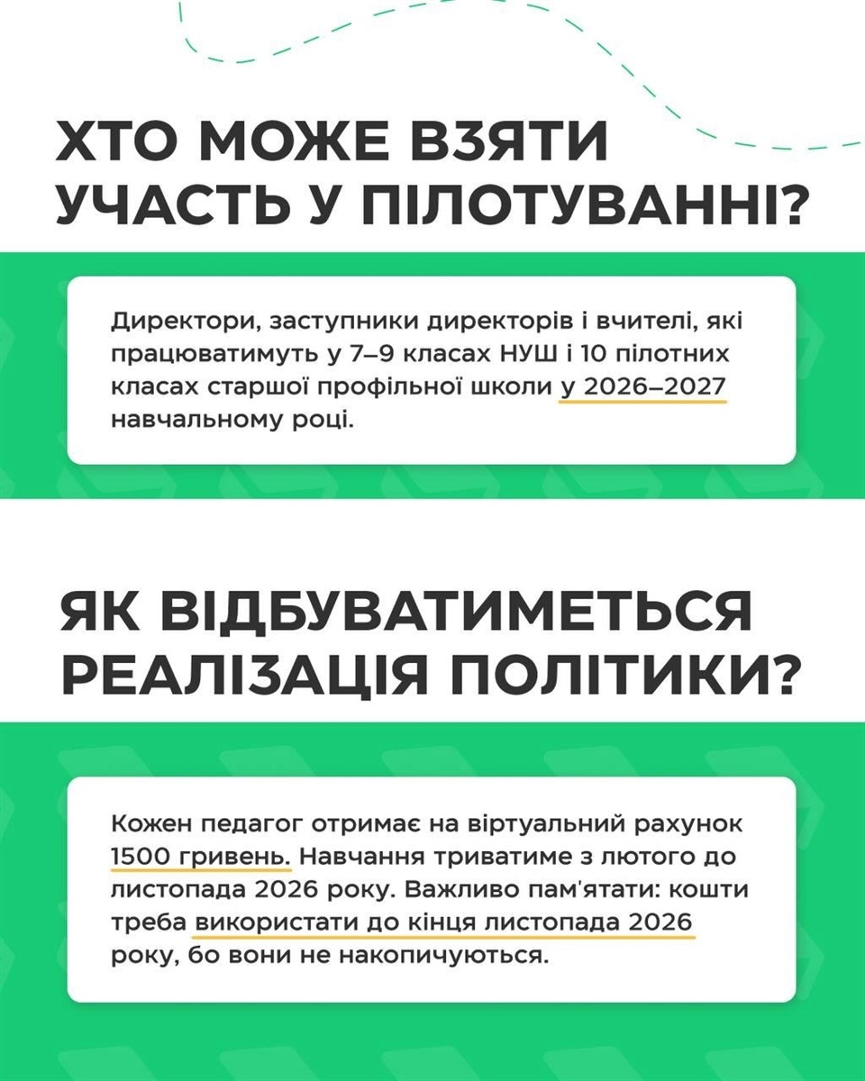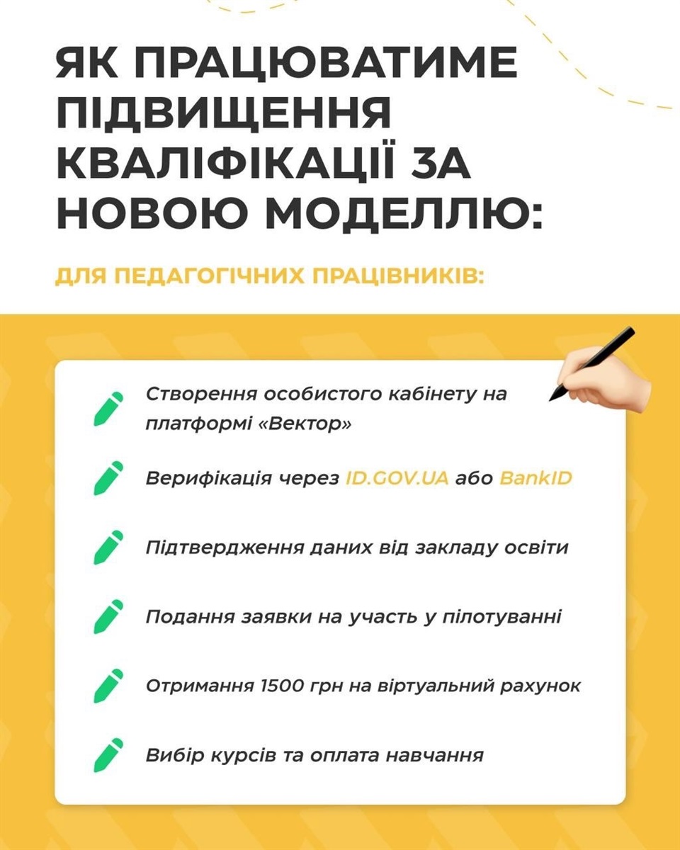 Це державна політика, що впроваджує новий механізм фінансування професійного розвитку педагогічних працівників. Відтепер держава нараховуватиме фіксовану суму коштів - 1500 грн - безпосередньо на віртуальний рахунок учителя, директора чи заступника директора закладу освіти. Педагогічний працівник через державну платформу зможе самостійно обирати суб’єкта та програму підвищення кваліфікації відповідно до власних професійних потреб.