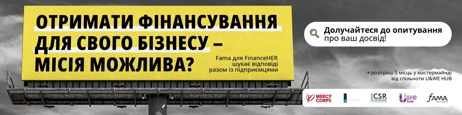 Дослідницька агенція Fama в межах програми FinanceHER (ініціатива CSR Ukraine та U&WE HUB) за фінансової підтримки Mercy Corps та у партнерстві з Урядом Нідерландів проводить національне дослідження доступу малого та середнього бізнесу до фінансових можливостей.
