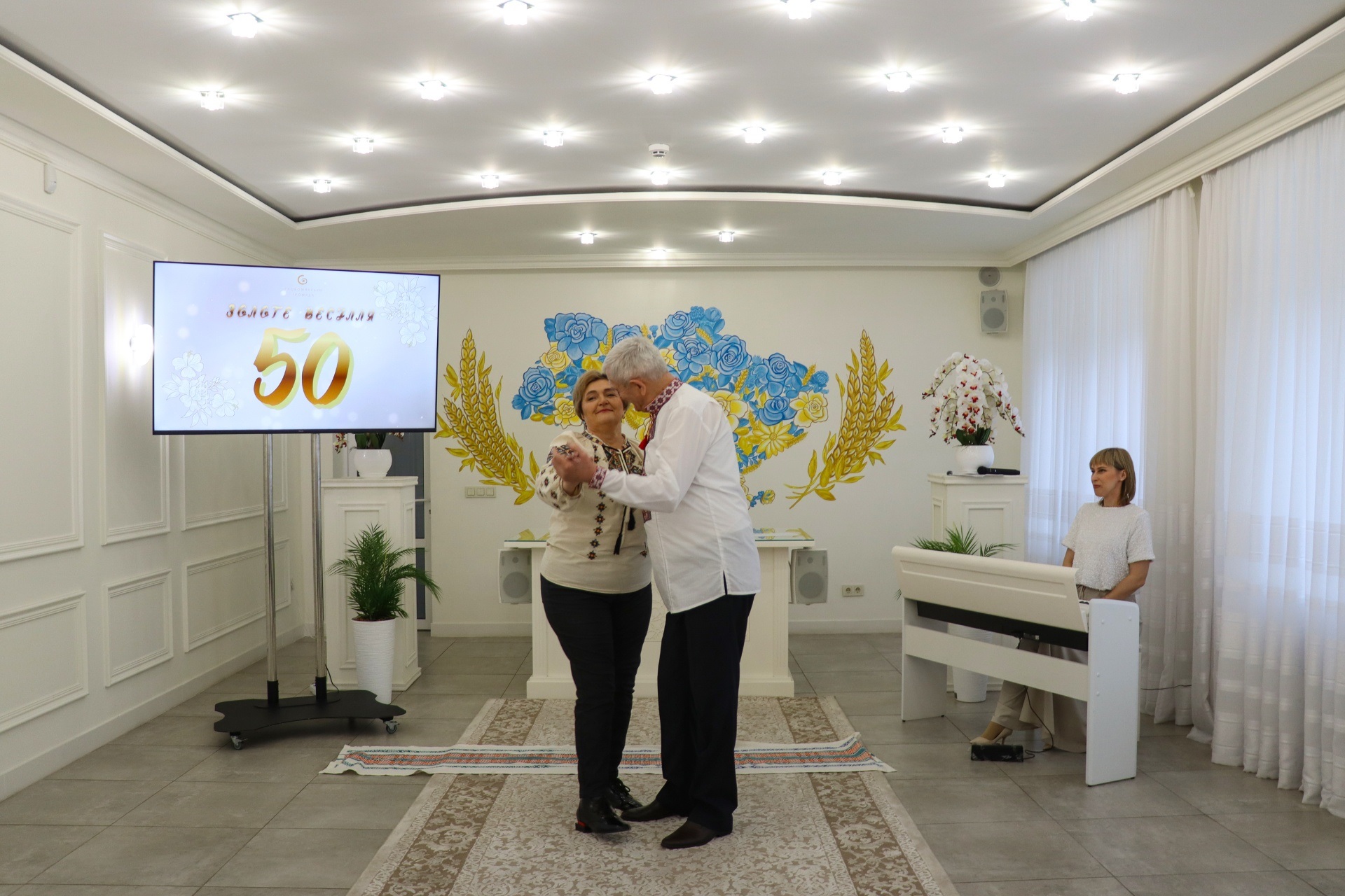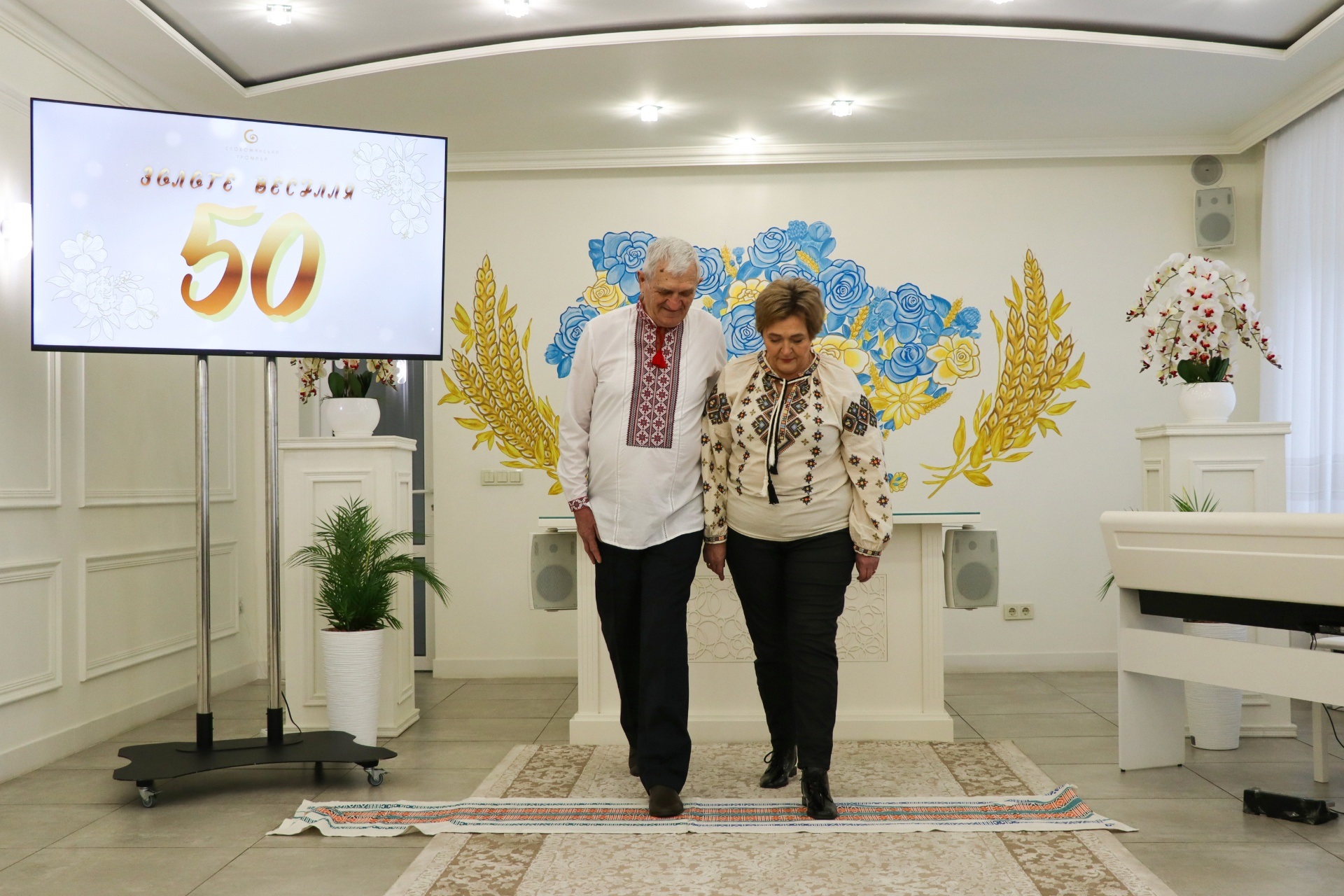 Особливим моментом церемонії став символічний крок на рушник, який для ювілярів простелили їхні онучки – як знак спадкоємності любові та поваги. Під звуки рідної пісні «В саду гуляла», яку пара часто співала в родинному колі на Вінниччині, золоті молодята закружляли у повільному танці.