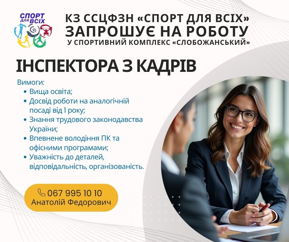 КЗ «Слобожанський селищний центр фізичного здоров’я населення «Спорт для всіх» запрошує на роботу старшого інспектора з кадрів у спортивний комплекс «Слобожанський».