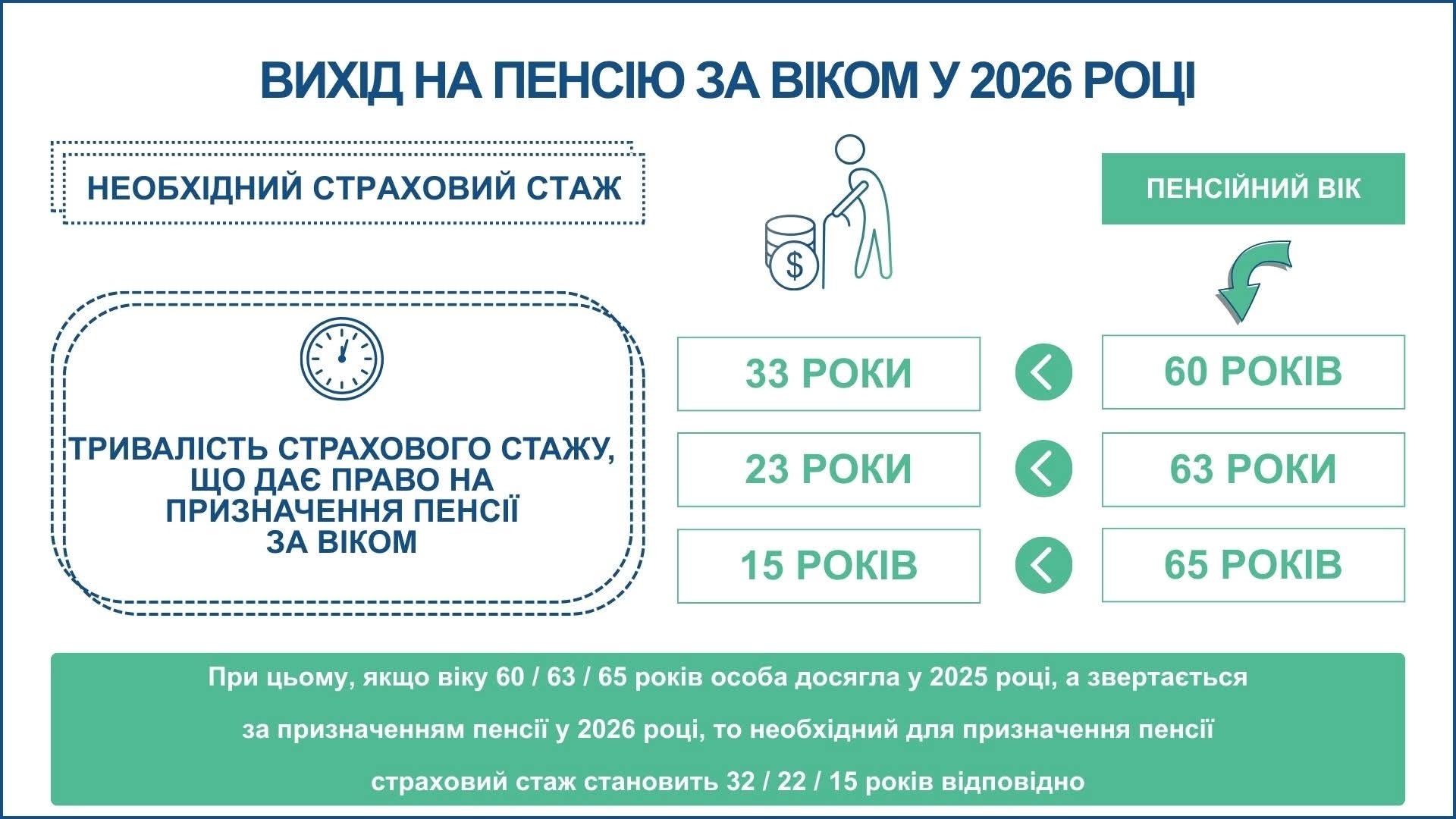 Важливо! Якщо віку 60 / 63 / 65 років людина досягла у 2025 році, а звертається за призначенням пенсії у 2026 році, то необхідний страховий стаж становить 32 / 22 / 15 років відповідно.