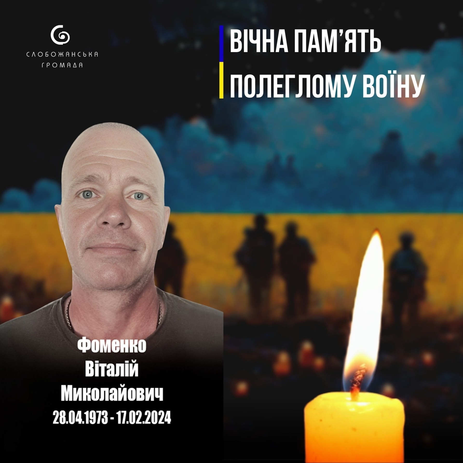 Сьогодні, 17 лютого, минає вже друга річниця, як Слобожанська громада втратила мужнього воїна, захисника та Героя Віталія Фоменка. Це ім’я назавжди закарбоване в історії боротьби за незалежність України. Світла та вічна пам’ять Герою! Його самопожертва залишиться в серці кожного з нас назавжди.