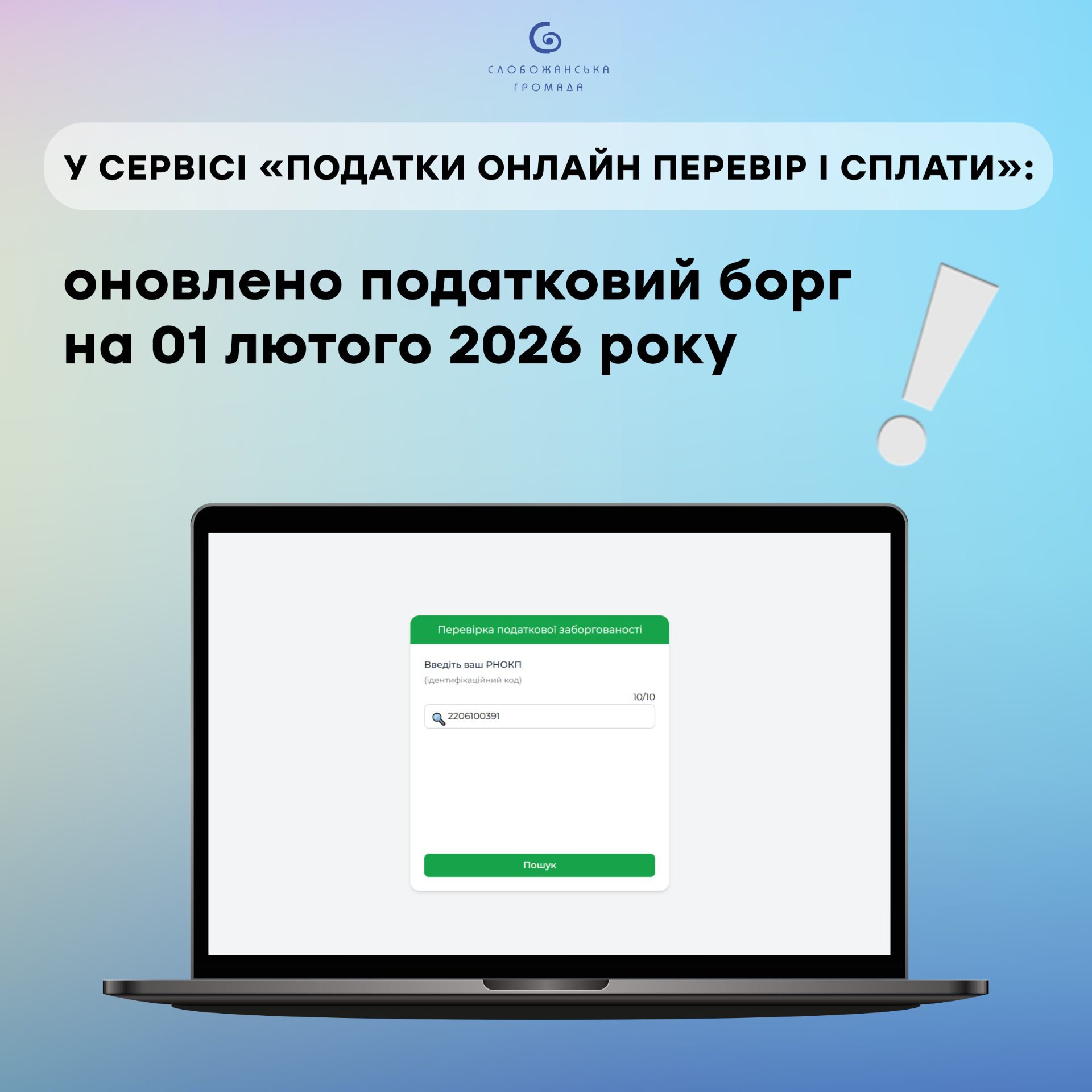 Оперативно дізнатися про наявність або відсутність податкового боргу до місцевого бюджету Слобожанської територіальної громади можна на офіційному сайті Слобожанської селищної ради, скориставшись електронним сервісом «Податки онлайн: перевір і сплати».