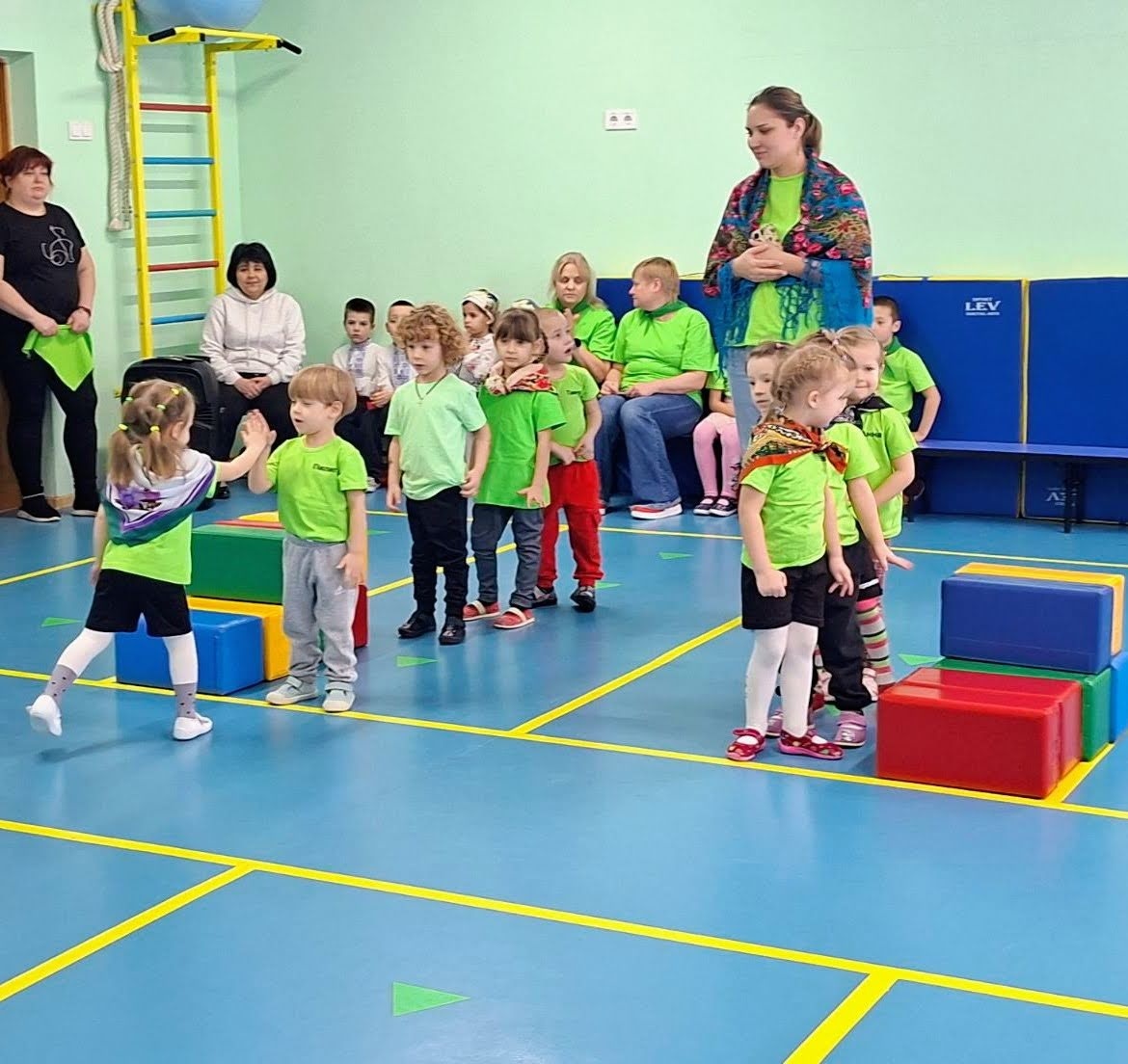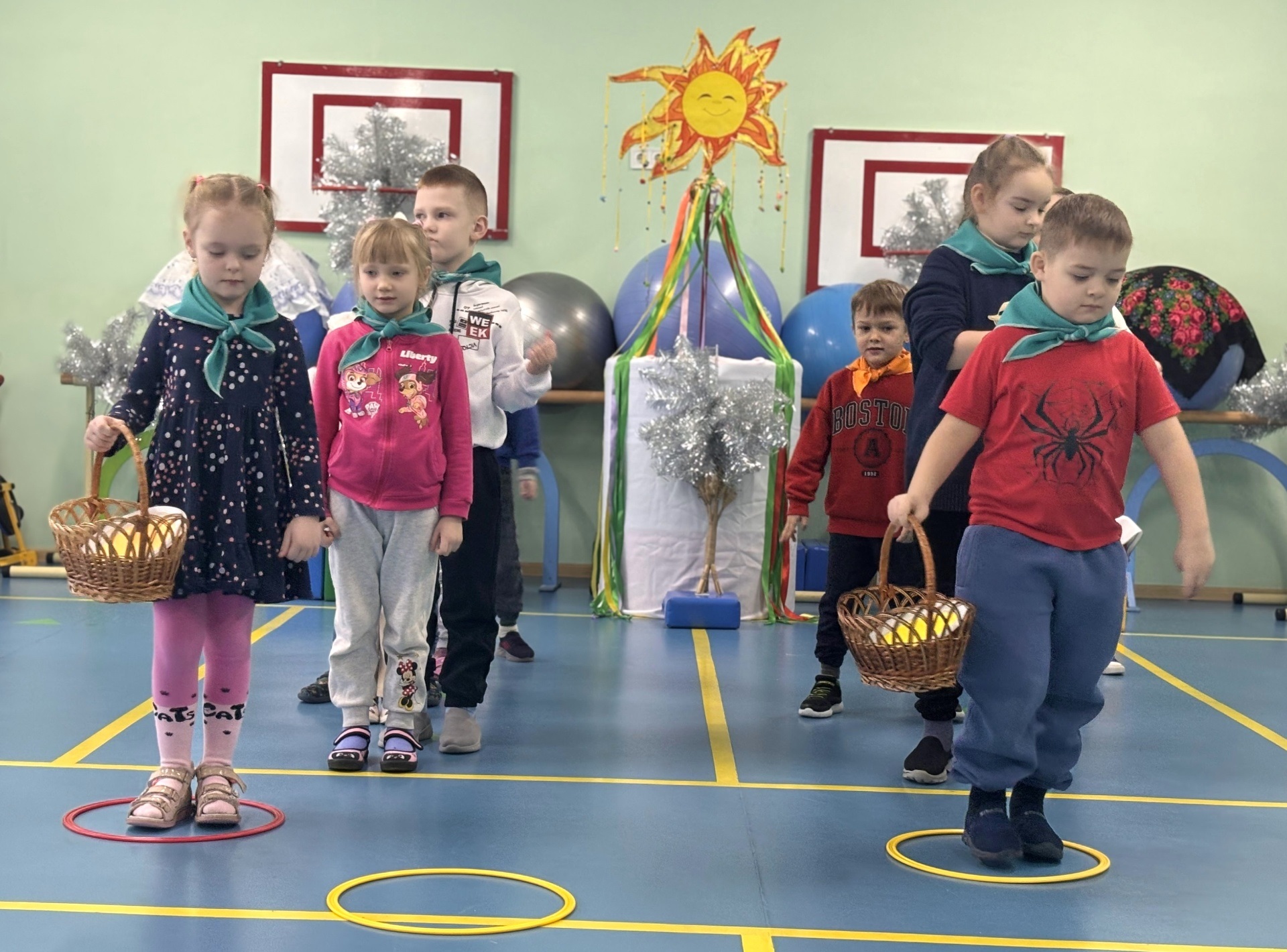 Теплі промінчики сонця перетворили уявний сніг на воду, що вкрила доріжки калюжами, але це не завадило друзям розносити гостинці. Вихованці середнього дошкільного віку вправно долали «вузькі доріжки» на гімнастичних лавах, демонструючи вміння тримати рівновагу, а старші дошкільнята спритно стрибали по проталинах через малі гімнастичні кільця, намагаючись не замочити ніжки.