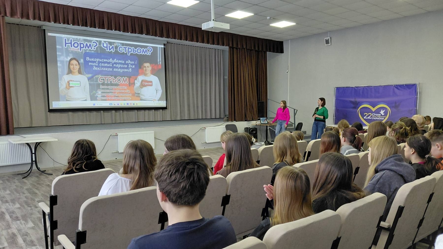 Під час інтерактивної лекції учні ознайомилися з основними правилами цифрової безпеки та обговорили актуальні виклики, з якими можуть зіткнутися в онлайн-просторі. Зокрема, йшлося про: