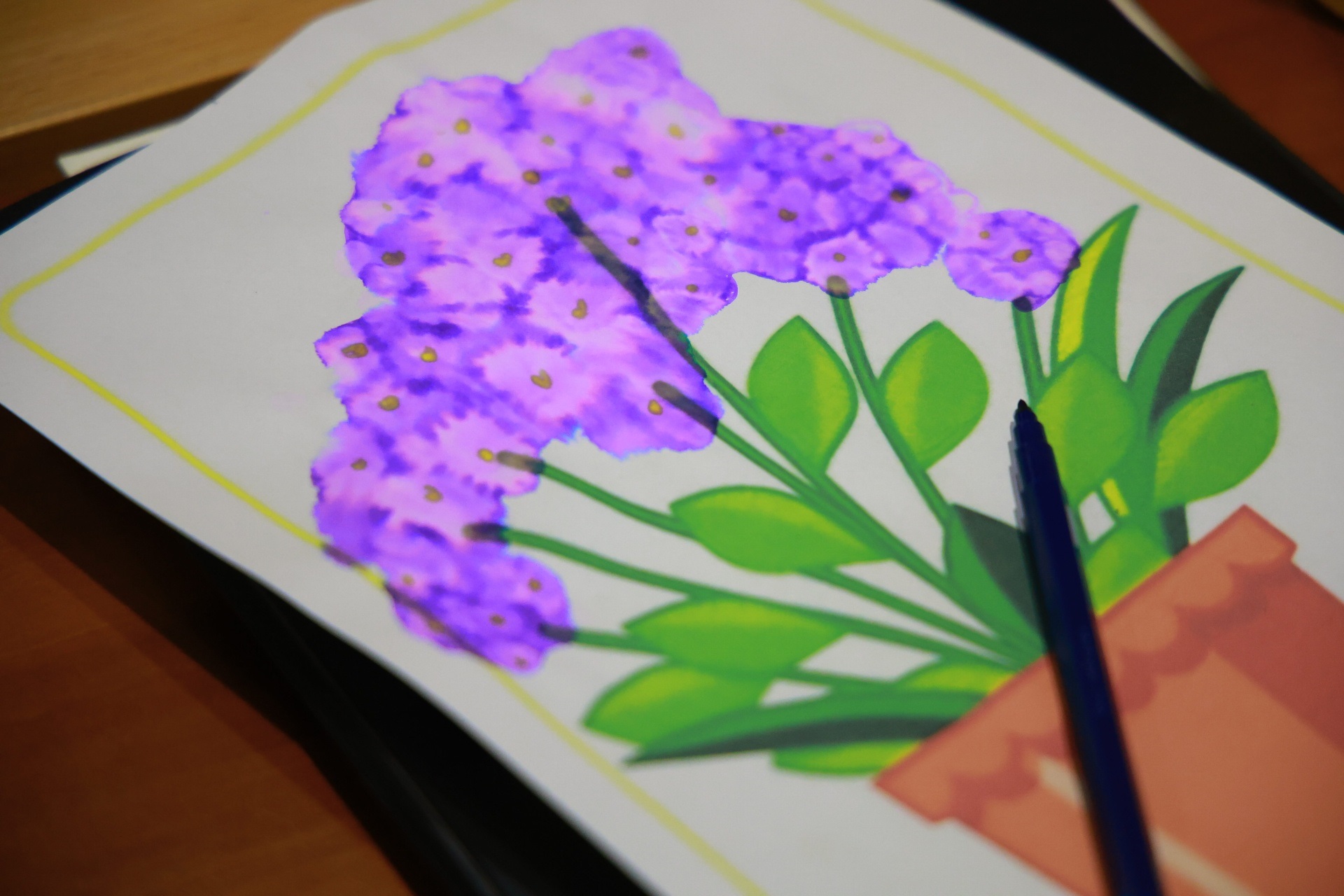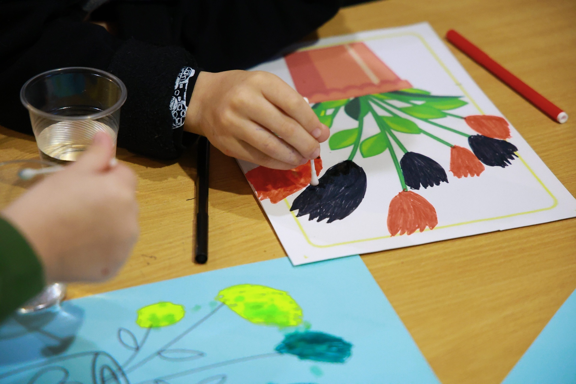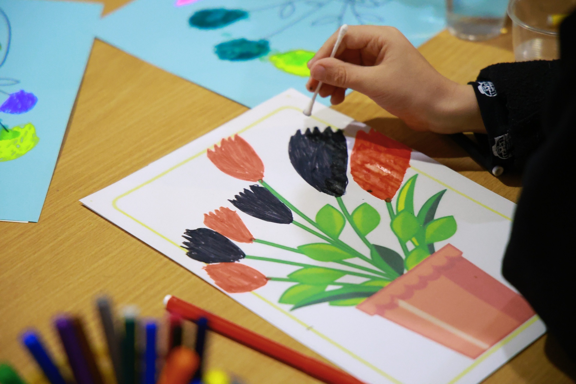 Художній етап: опанування техніки розфарбовування за допомогою фломастерів та ватних паличок для створення яскравих флористичних композицій.