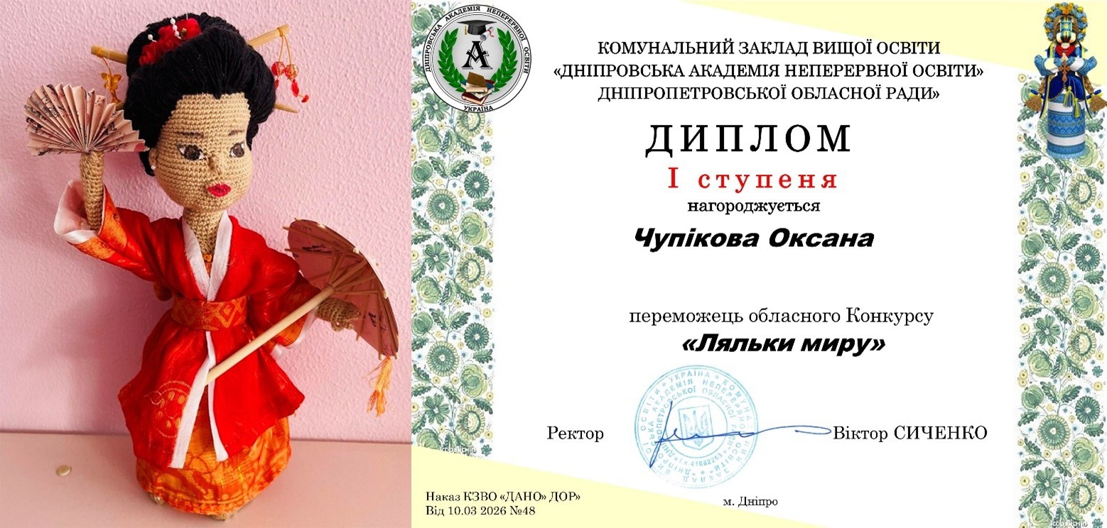 Вихователь закладу дошкільної освіти «Берізка» Оксана Чупікова здобула перше місце в обласному конкурсі «Ляльки миру», який проводився на базі Дніпровської академії неперервної освіти.