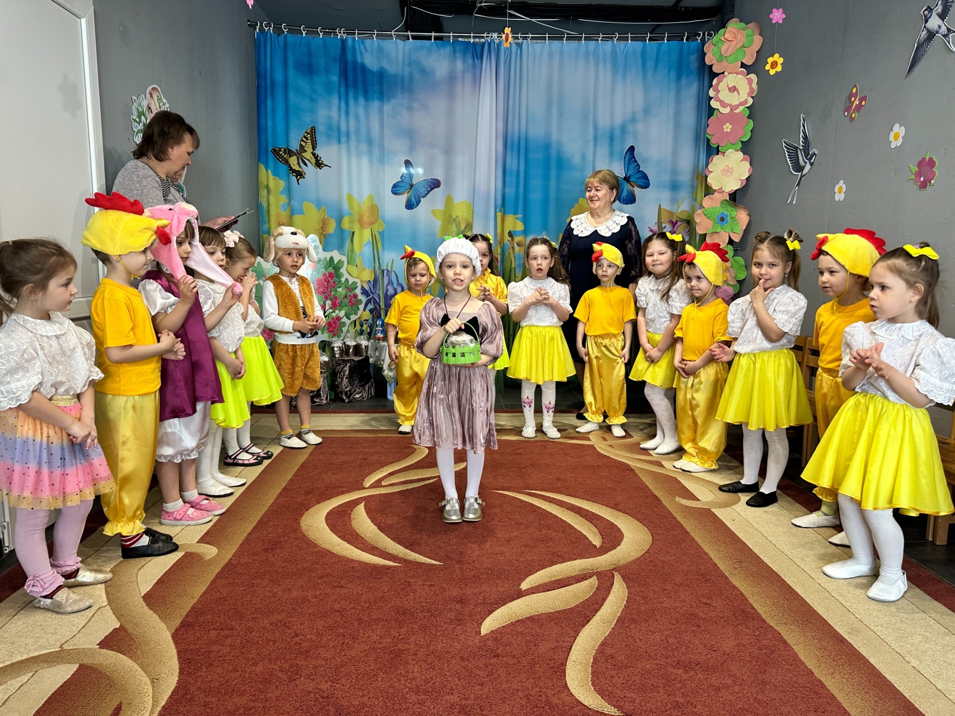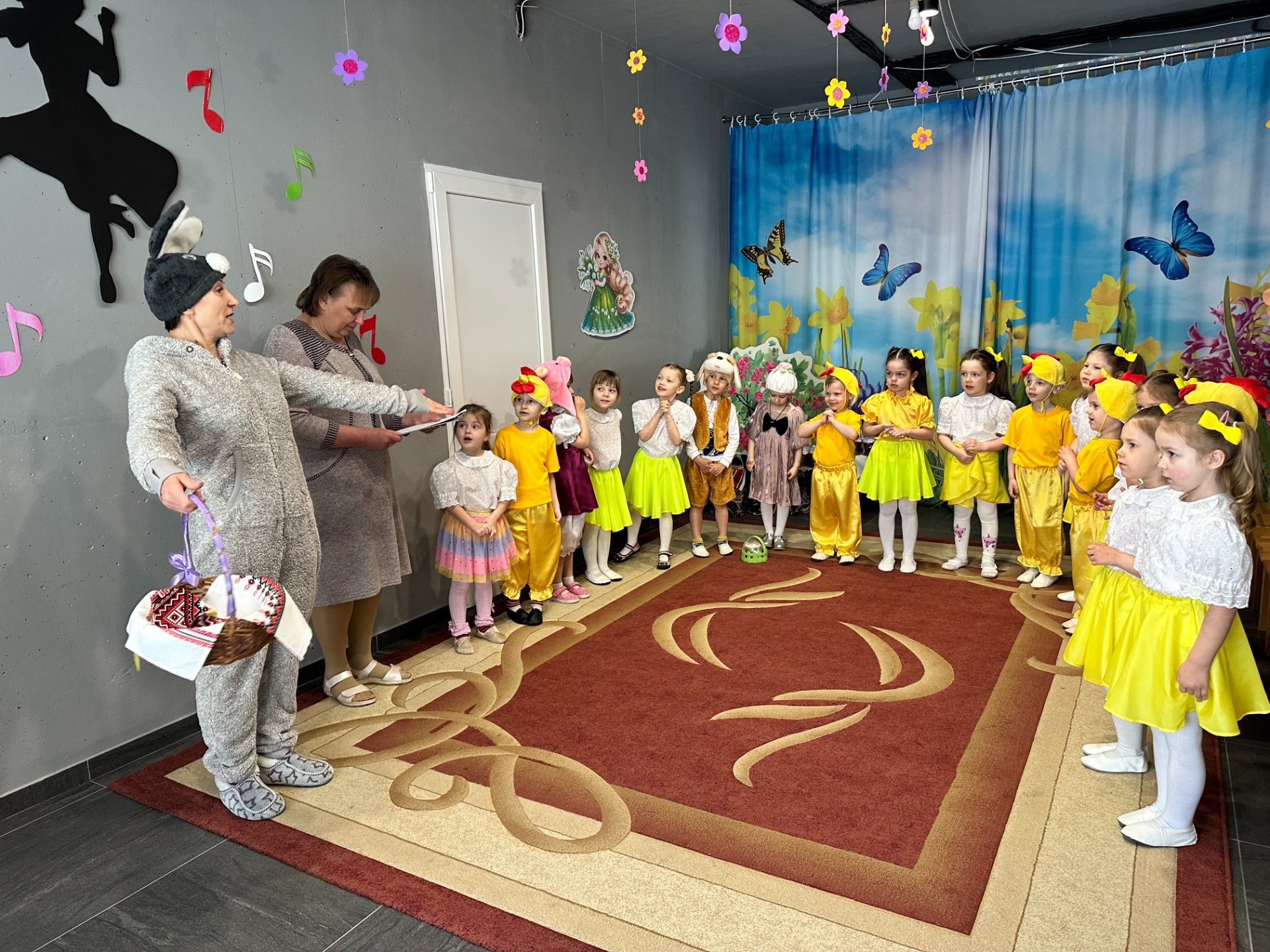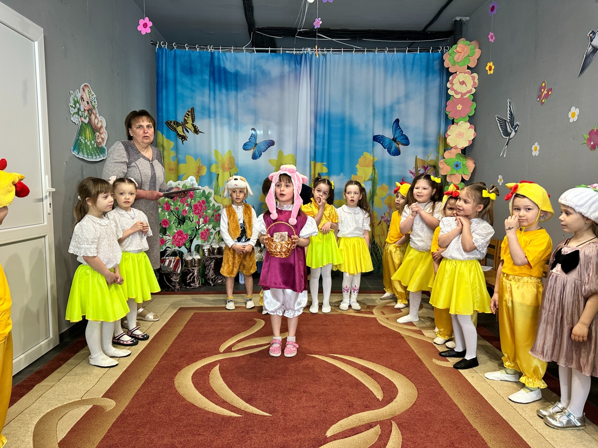 До вихованців груп «Казка» та «Сонечко» завітав веселий Зайчик. Разом із дітьми він почав збирати великодній кошик. На допомогу прийшли казкові гості: Свинка принесла сальце, Собачка – ковбаску, а маленькі Курчатка подарували яєчка. Справжнім сюрпризом стала поява Пасочки, яка привітала всіх зі святом та побажала добра і радості.